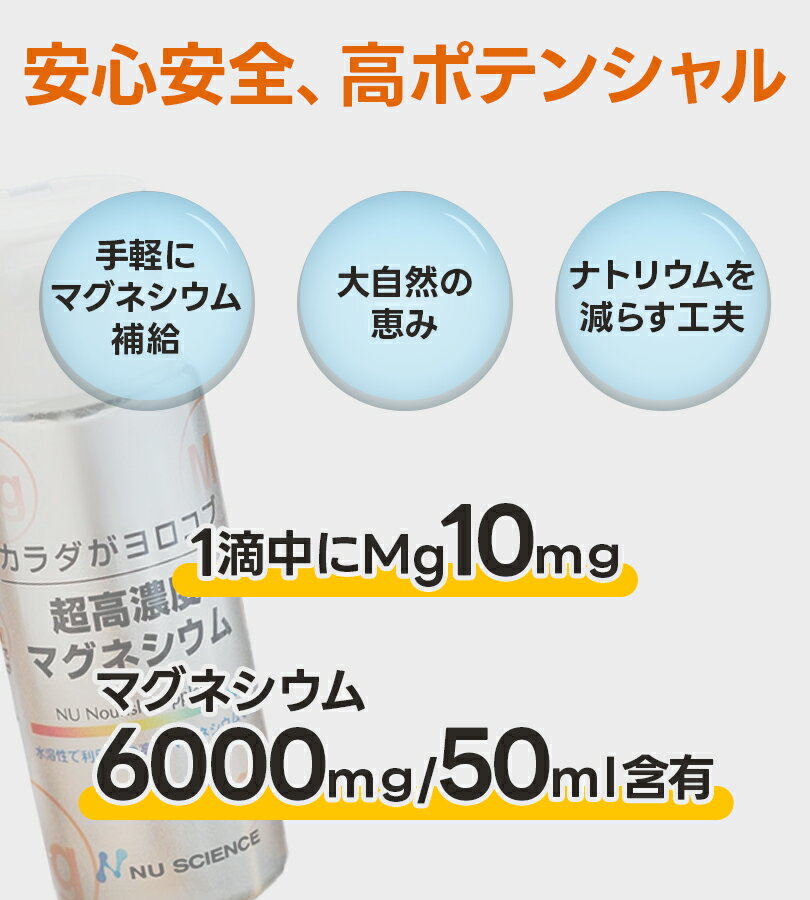 ニューサイエンスのカラダがヨロコブ 超高濃度マグネシウムは、水溶性で利用度の高いマグネシウムです。「マグネシウム:ナトリウム=73:1」の超高濃度を実現。不足しがちなミネラルのマグネシウムが食卓で手軽に補給出来ます。1日の目安は10ー20滴(約1ー2ml)を飲み物に混ぜてお召し上がりください。飲料水、珈琲、紅茶、アルコール、お味噌汁などの飲み物をはじめ、炊飯時、1合に対して3滴程度ご使用ください。商品名超高濃度マグネシウム名称 栄養補助食品内容量 50ml原材料名 マグネシウム賞味期限 パッケージに記載保存方法 高温多湿を避けて冷暗所で保存原産国名 日本メーカー・製造 株式会社ニュー・サイエンス京都市中京区釜座通三条上がる突抜町809番地(TEL 075-252-0361)区分 食品/日本製広告文責 Cheeky株式会社(TEL:0358307901)※必ずお読みください※ ※「原産国」表記について規定に基づき、「原産国名」は”最終加工が行われた国”を記載しております。「原料の原産地」とは異なりますので、予めご了承の程よろしくお願い致します。※妊娠中・授乳中・処方された薬を服用している方や、特定原材料・特定原材料に準ずるもの等のアレルギーをお持ちの方は、かかりつけのお医者様にご相談の上、ご購入・お召し上がりください。また、アレルギーに関しては個人差がありますので、特定原材料・特定原材料に準ずるもの等の食物アレルギーをお持ちではない方でも、お体に合わないなと感じられた場合はすぐにご使用をやめ、お医者様にご相談下さいますよう、よろしくお願い致します。【検索用】