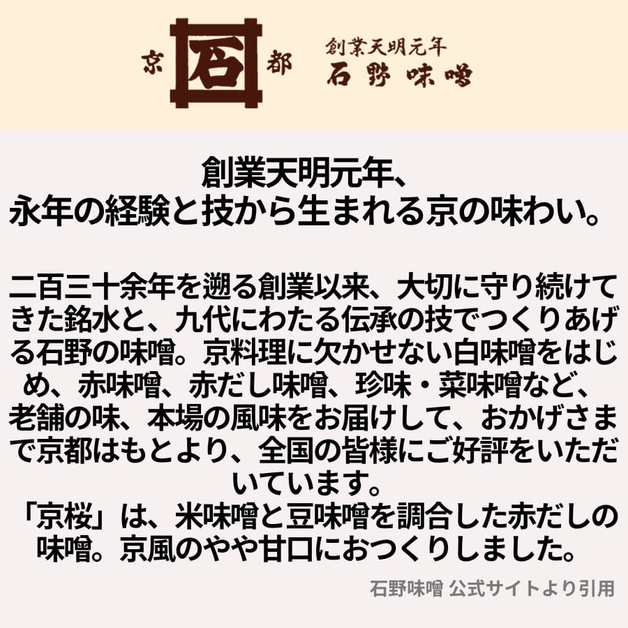 【商品説明】二百三十余年を遡る創業以来、大切に守り続けてきた銘水と、九代にわたる伝承の技でつくりあげる石野の味噌。京料理に欠かせない白味噌をはじめ、赤味噌、赤だし味噌、珍味・菜味噌など、老舗の味、本場の風味をお届けして、おかげさまで京都はもとより、全国の皆様にご好評をいただいています。「京桜」は、米味噌と豆味噌を調合した赤だしの味噌。京風のやや甘口におつくりしました。石野味噌 公式サイトより引用