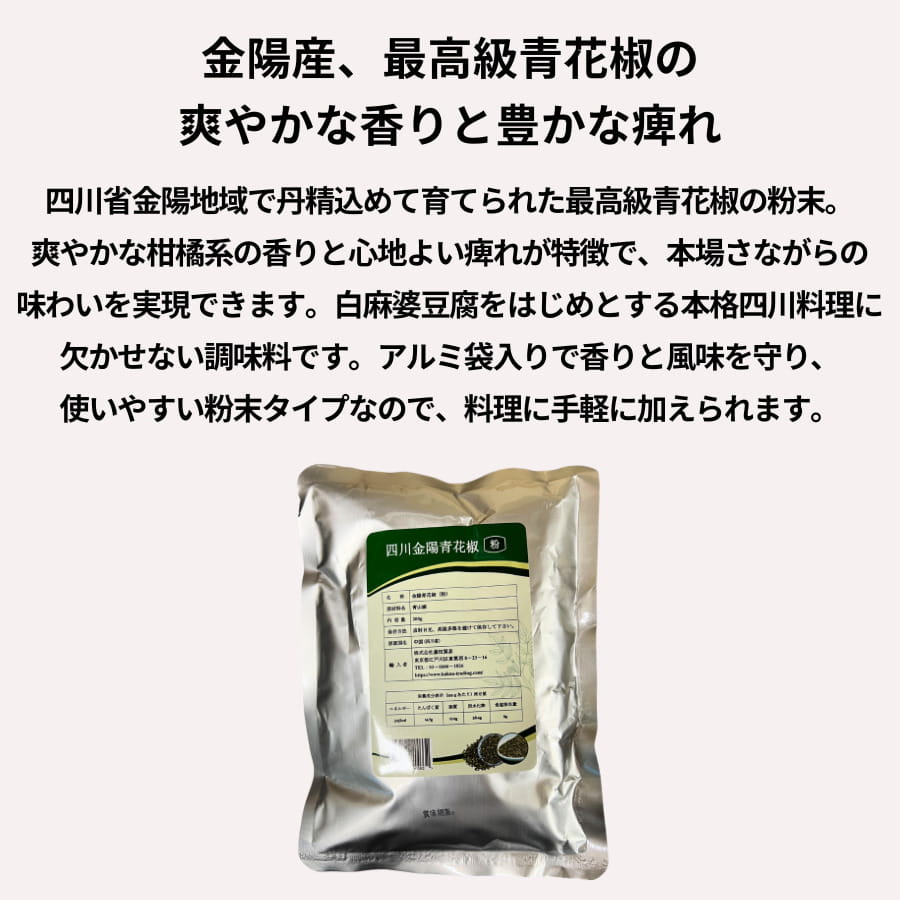 【商品説明】四川省金陽地域で丹精込めて育てられた最高級青花椒を粉末に加工しました。爽やかな柑橘系の香りと心地よい痺れが特徴で、本場さながらの味わいを実現できます。白麻婆豆腐をはじめとする本格四川料理に欠かせない調味料です。アルミ袋入りで香りと風味を守り、使いやすい粉末タイプなので、料理に手軽に加えられます。