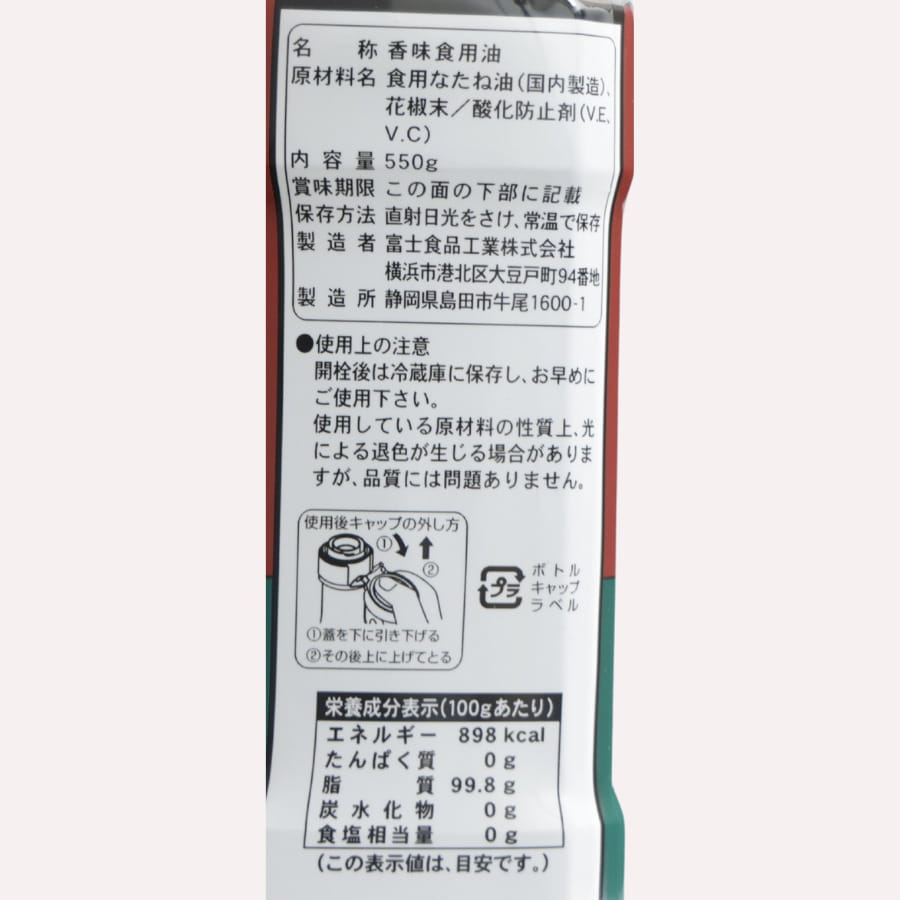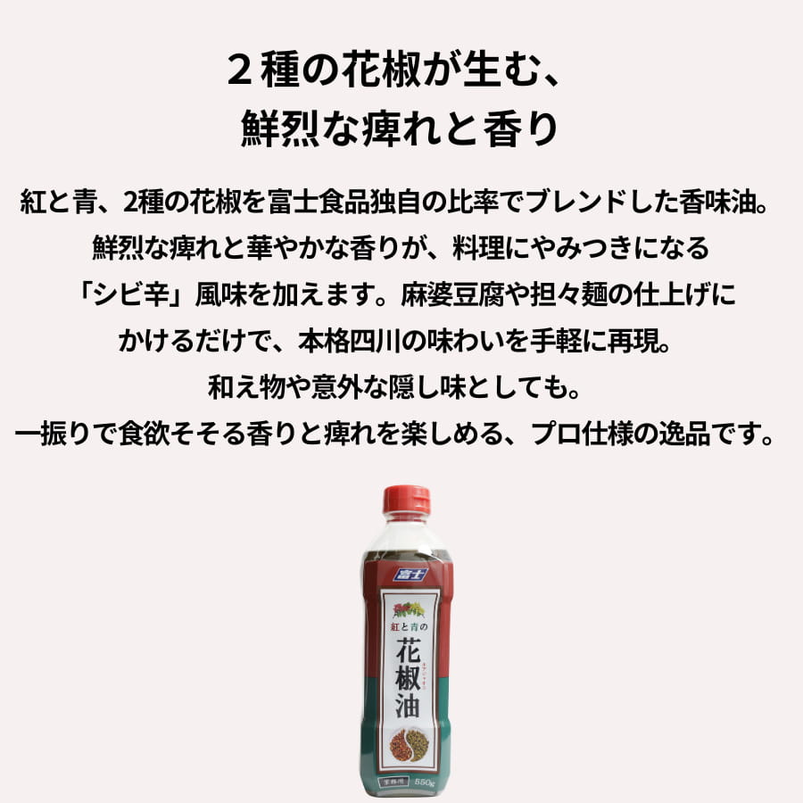 【商品説明】紅と青、2種の花椒を富士食品独自の比率でブレンドした香味油。鮮烈な痺れと華やかな香りが、料理にやみつきになる「シビ辛」風味を加えます。麻婆豆腐や担々麺の仕上げにかけるだけで、本格四川の味わいを手軽に再現。和え物や意外な隠し味としても。一振りで食欲そそる香りと痺れを楽しめる、プロ仕様の逸品です。