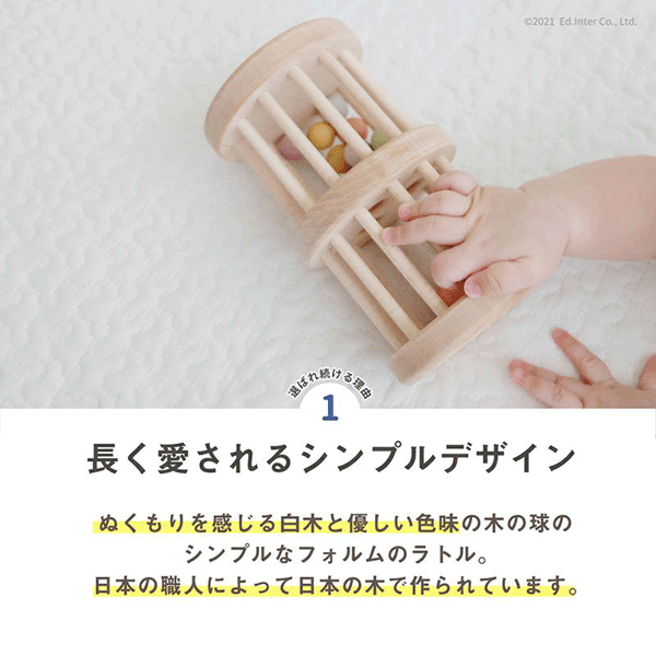 ~ころころ転がすと木の球の心地よい音が響く、 タワーの形をしたラトル♪~ 縦にして上下を返すとパラパラ落ち る球の動きと音を楽しむことができ、 横にして転がすと赤ちゃんの目の前でカラコロと音をたて、 色の移り変 わりを楽しむことができます。 □ 仕様 □ 対象年齢:6ヶ月から セット内容:本体×1 (中の球×10) 素材:日本産天然木 安全基準: ・CE(ヨーロッパEU諸国共通の安全基準) 対象年齢に適合する安全基準で、徹底した品質管理をしています。 ※・天然の木材を使用した商品です。木材固有の木目や色の濃淡など、ひとつひとつ異なる天然素材ならではの表情をお楽しみください。 ※北海道・沖縄県は、別途送料がかかります。