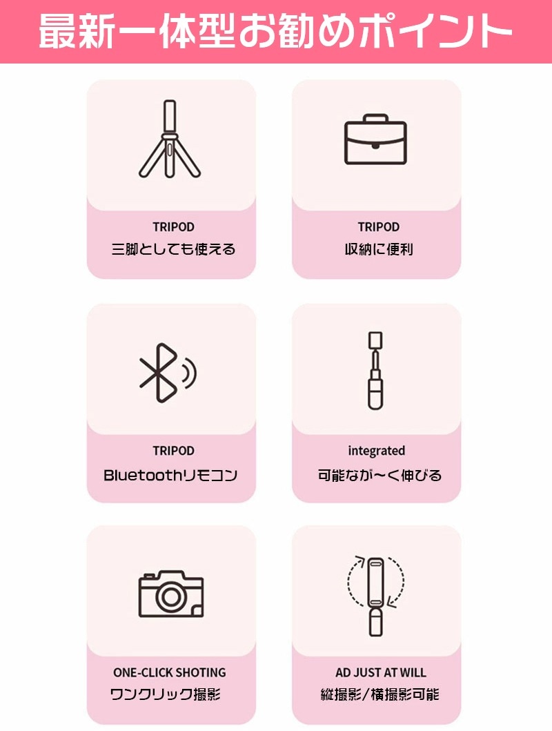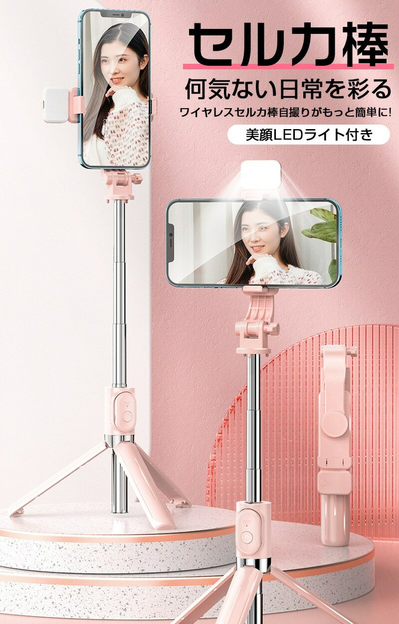 商品名:LEDライト内蔵 三脚一体型 自撮り棒 360度回転対応 美肌補光&Bluetoothリモコン付 スタイル:本体サイズ:収納時20cm/最大伸長120cm重量:298g材質:アルミ合金(スティック部)、ABS樹脂(ホルダー部)対応端末:スマートフォン幅58-88mm/厚さ12mm以内(ケース装着可)カラー:マットブラック電源:リモコン用CR2032ボタン電池×1(付属)付属品:簡易収納ポーチ、取扱説明書 特徴:1.三脚&一脚兼用デザインハンドル部分が3方向に展開可能な一体型三脚を採用。自撮り棒としての使用に加え、自立式スタンドとしてスマホの遠隔撮影ビデオ通話動画鑑映にも最適。パーツの付け外し不要で、シーンに応じて瞬時にり替え可能。2.7段階伸縮&360°フリーアングル調整最大1.2mまで伸縮可能なアルミ製スティック(6段階調整)。単独撮影から大人数集合写真まで対応。スマホホルダー部は縦横無制限に回転し、最適な構図をキープ。3.10m圏内Bluetooth遠隔操作着脱式リモコンでシャッターを自に操作。障害物がない環境では最大10mの距離からでも確実に作動し、全身ショットや風景との合成写真も手ブレなしで撮影可能。4.安定性&耐久性重視設計滑り止めゴム付き三脚基底で不安定な地面でも倒壊防止耐腐食性アルミ合金素材採用(ステンレス部品併用)防滴加工済みでアウトドア使用OK 注意事項:商品のお色は撮影時の環境などにより、実際の商品と多少の違いが生じることがございます。実物の色に近づけるように努めていますが、お使いの環境により実物の色と異なって見える場合がございます。ごの上お買い求めください。万が一や入荷待ちとなる場合は別途メールにてご連絡いたします。本製品の利用による本体の紛失、破損、汚、及び内部データの破損には一補償いたしかねます。同一注文内で日が異なる場合一番遅い日にまとめて出荷となります。ご注意:海外輸入品のため、入荷時期より部品とデザインなど変更する場合がございますので、予めごください。