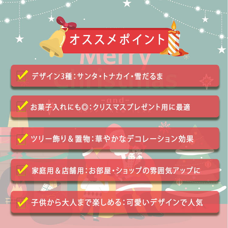 商品詳細ブラド名bluerose fashion street商品名クリスマス 靴下サイズ30×47cmカラーno1 no2 no3商品メリッ★大容量サイズ!やお菓子を入れることができます。★クリスマスツリーに飾ってもお部屋に飾ってもクリスマス気分が盛り上がります。 飾って可愛い・使って嬉しいクリスマス靴下!サタクロース、ナカイ、雪だるまデザイのクリスマスソックス。ツリーやお部屋の飾り付けはもちろん、お菓子や小物を入れてにも活躍。子供へのギフはもちろん、店舗やカフェの装飾にもぴったりのアイテムです。デザイ3種:サタ・ナカイ・雪だるまお菓子入れにも◎:クリスマス用に最適ツリー飾り&置物:華やかなデコーショ効果家庭用&店舗用:お部屋・ショッの雰囲気アッに子供から大人まで楽しめる:可愛いデザイで人気クリスマスツリーの飾り付け子供へのお菓子ギフソックスお部屋や玄関のイテリア装飾店舗ディスイやイベ装飾子供へのギフを探すご家庭/イテリア・店舗装飾を準備する方/おしゃれで可愛いクリスマス雑貨を探している方ご使用上の注意●お肌に合わない場合や、かぶれ・かゆみ等を感じた場合はご使用を おやめください。●メーカーの生産時期や生産ロッにより、同じ商品でも色の出方(濃淡)や柄が多少異なる場合がございます。また、撮影時の光の加減やお客様がお使いのモニターの影響などにより、商品紹介画像の色と実際の商品の色が若干異なる場合もございます●サイズは測り方により誤差が生じる場合がございます。同じサイズでも色やデザイによって若干大きさが異なる場合もございます。●本来の目的以外でのご使用はおやめください。生産国made in china