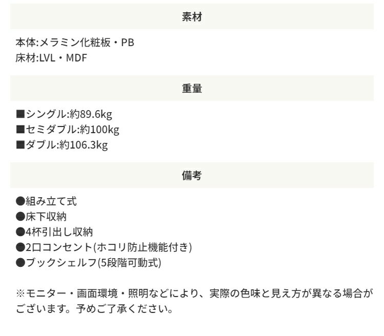 【備考】 ※ベッドフレームとマットレスのセットです。 ※マットレスは片面仕様です。 ※商品仕様は予告なく改良となる場合があります。 ※ご使用のモニターによって色味が違って見えます。 ※寝具や撮影小物等は付属しません。