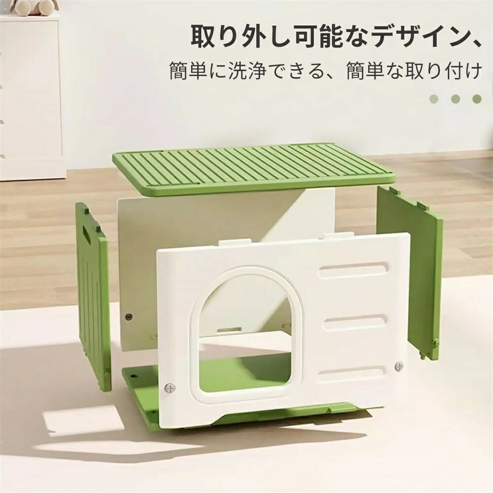 【多機能ペットハウス 】: 耐水性、耐紫外線性、耐腐食性に優れたPE材質を使用し、雨天でも晴天でもお使いいただけます。 屋内外問わずご使用いただける理想的なペットハウスです。 【耐荷重抜群 】: フラットトップデザインを採用し、上面にも下面にもペットが寝ることが可能です。 高品質なPE素材を使用しており、長期間にわたって使用できる耐久性を実現しています。 丈夫でペットが傷つけにくい構造のペットシェルターです。 底部は補強された構造となっており、ペットケージをより堅固にし、安定性を高めることで、50kgの重さにも耐えることができます。 【お手入れ簡単】: 滑らかな表面で汚れが付きにくく、お手入れが簡単です。 汚れが目立つ場合は、水で洗い流して乾かすだけで再使用可能です。清潔を保つために定期的なクリーニングを推奨します。 良好な通気性とオールシーズン快適な環境を提供するサイドベンチレーションで、ペットがリラックスできる場所です。 【ユーザーフレンドリーな設計】: 工具を必要としない留め具設計で、取り付けが簡単です。 グリップ付きで移動も楽々。 品質にこだわったデザインが手作業での組立を簡単かつ便利にし、手を傷つけません。 キュートなカートゥーンのデザインが心を和ませます。滑り止めマットが底部についており、滑りにくく静かです。 【四季通用】: 暑い夏には暑さ対策の夏用ベッドとして使って、冬になったら、ふわふわなマット入れて暖かなペットハウスにも変身して、四季を通じて通用する犬小屋です。 仕様 素材:HDPE 季節:四季通用 適用:中小型犬?猫 配置場所:屋内屋外 特徴:防風・防雨 寸法: タイプA:53*41*38CM 重さ:約3.5kg タイプB:80*58*53CM 重さ:約7.5kg ※測定の方法によって2-3cmの誤差がある場合があります。 注意事項 ■商品の撮影には最大限注意を払っておりますが、閲覧時のモニター環境によりましては実際の商品と若干違うお色味に映ることもございます。