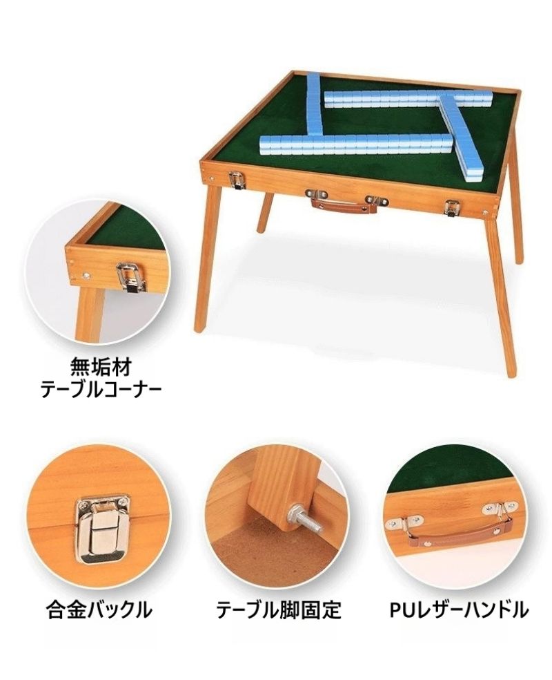 商品情報 ■基本仕様 製品名:折り畳み式麻雀卓 カラー:原木色 重さ:約3.22KG/3.7KG ■製品特徴 ・収納場所を取らず車への積込も楽々。 ・持ち運びに便利なスーツケーススタイル。 ・難しい組立は一切ナシ!すぐに麻雀を楽しめます。 ・届いてすぐに麻雀開始!使い終わったらかんたん収納! ・牌トレイごとポータブル麻雀卓に収納できるので便利! ・旅行や合宿などの外出時に持ち運び便利なポータブル麻雀セットです。 ・家でも外でも車でも!何処でも気軽に麻雀が楽しめる麻雀セットです。 ・麻雀収納と台機能を兼ね備えて折りたたみもできるポータブル麻雀卓。 ・麻雀のあとは折りたたんでかんたん収納!軽量タイプなので持ち運びもスムーズです。 ・簡単で折りたためる!収納に便利です。 折り畳み作業は女性一人でも簡単にできます。 ・ミディアムサイズなので混ぜる時の音も小さく、ジャラジャラとした騒音を気にせずに楽しめます。 ・コンパクトながらしっかり遊べる本格的なセット!折りたたみ式のテーブルを広げれば簡単にミニ雀卓が完成します! ・ご自宅で手軽に、本格的なマージャンが楽しる麻雀卓です!家族団欒や、友人・親戚との集まりに、一台あると楽しいマージャンテーブルです! ・麻雀クラブ、別荘、福祉施設、公民館、ご家庭用、麻雀教室、カルチャーセンター、老人ホーム、大学の寮、宿泊施設等でお使い頂いております。