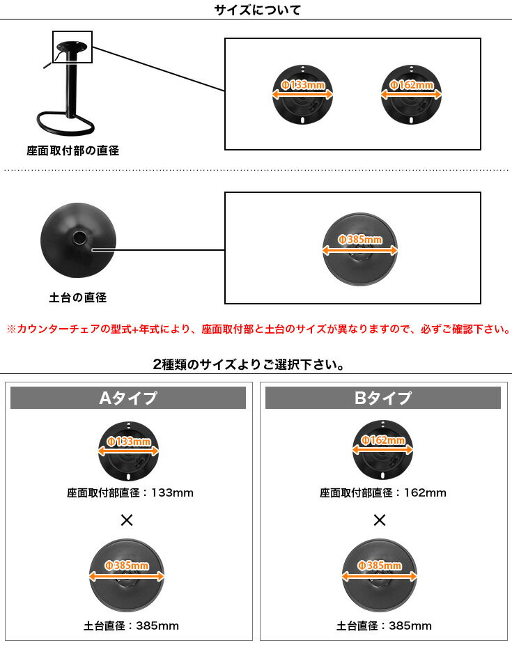 ※年式や形式などにより仕様変更をおこなっている場合がございます。 ご購入の前にお手元にございますカウンターチェアの座面をお取り外し頂き 座面取付部の直径と土台の直径を計測してください。 ※取付部違いによる返品や交換をお受けする事ができません。 お手元の製品を必ず実測してください。 ※座面取付用のネジはお手元の物を引き続きご使用ください。 ※株式会社安吉が販売するカウンターチェア専用の部品となります。 【適合型番】 WY-119、WY-121、WY-147、WY-159Q、WY-201、WY-259、WY-285、WY-301、WY-321V、 WY-413、WY-451-L、WY-459、WY-465V、WY-523、WY-585、WY-614、WY-705、WY-864、 FK-229、FK-685、FK-785、 DA-901、DA-902、DA-903、DA-904、 KC-14、KC-15、KC-16、KC-19、KC-20、KC-31、KC-33 ※WY-101には適合しませんのでご注意ください。 ※多少のキズ等がある場合がございます。予めご了承下さい。 ※お客様の方で組み立てが必要となります。 ※昇降式ですが体重が50Kg未満の方はうまく作動しない場合がございます。 ※この商品は家庭用となります。 (耐荷重約90kg) ※360度回転します。 ※安全のため、組み立ての際は軍手などを着用してください。 ※シリンダーの保護キャップが取りにくい場合は すべり止め効果を期待できるもの(ゴム手袋、輪ゴムを巻くなど)を用いると 取り外しやすくなりますのでお試しください。