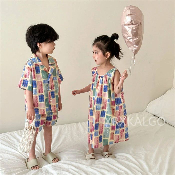 子供服 セットアップ 双子服 キッズ 女の子 男の子 2点セット 兄妹お揃い ワンピース 半袖 綿100% シャツ+ズボン レインボー チェック柄 ホワイト ブラック リゾート パンツセット 春夏着 上下セット おしゃれ 通学着 可愛い 上下セット 80-150