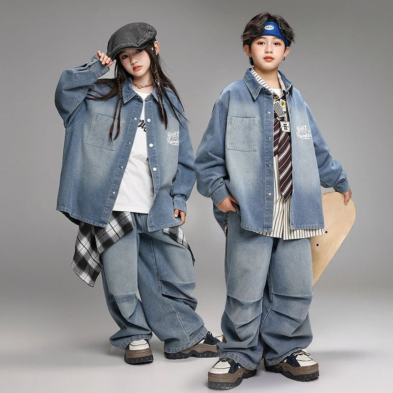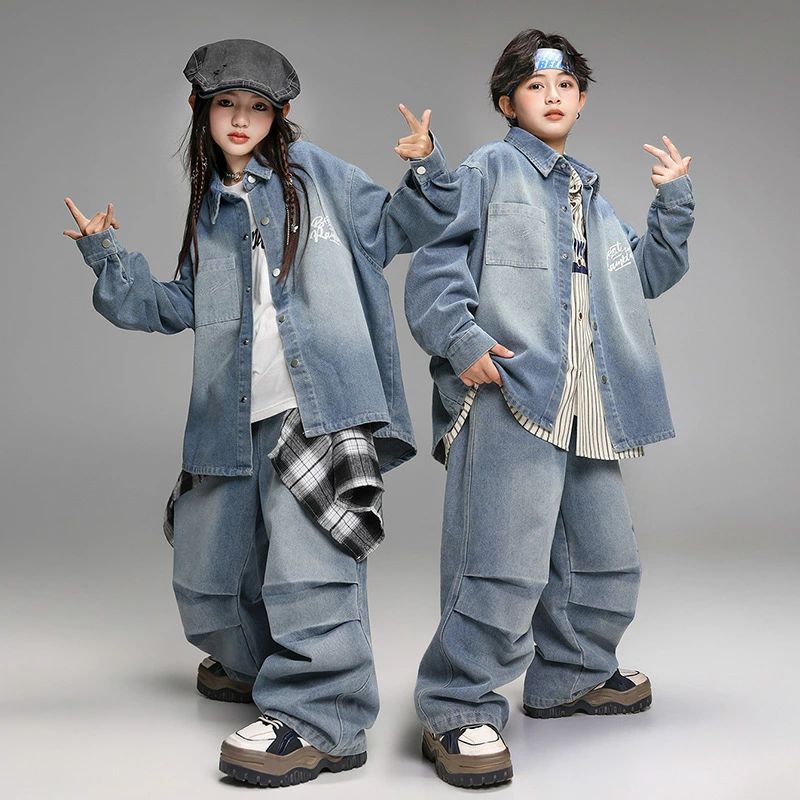 デニム キッズ ダンス衣装 単品 セットアップ 男の子 女の子 子供服 長袖 デニム シャツ ジャケット パンツ ゆったり 練習着 レッスン着 カジュアル ゆったり ダボダボ 練習着 男の子 女の子 子供 ジャズダンス ステージ衣装 派手 チーム 団体 ダンス 保育園