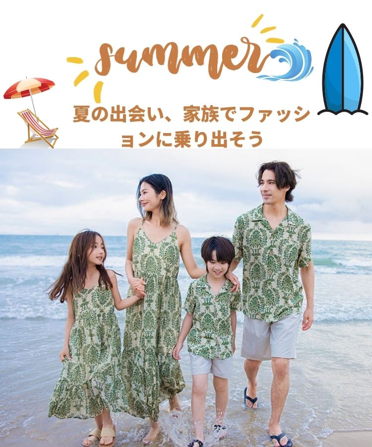グリーン 緑 葉柄 親子 ペアルック アロハシャツ ワンピース ペアtシャツ 花柄 ハワイ 旅行 リンクコーデ 親子ペア カップル アロハシャツ 体型カバー ロングワンピース ママ 男の子 パンツセット 親子リンクコーデ 90-160 S-3XL