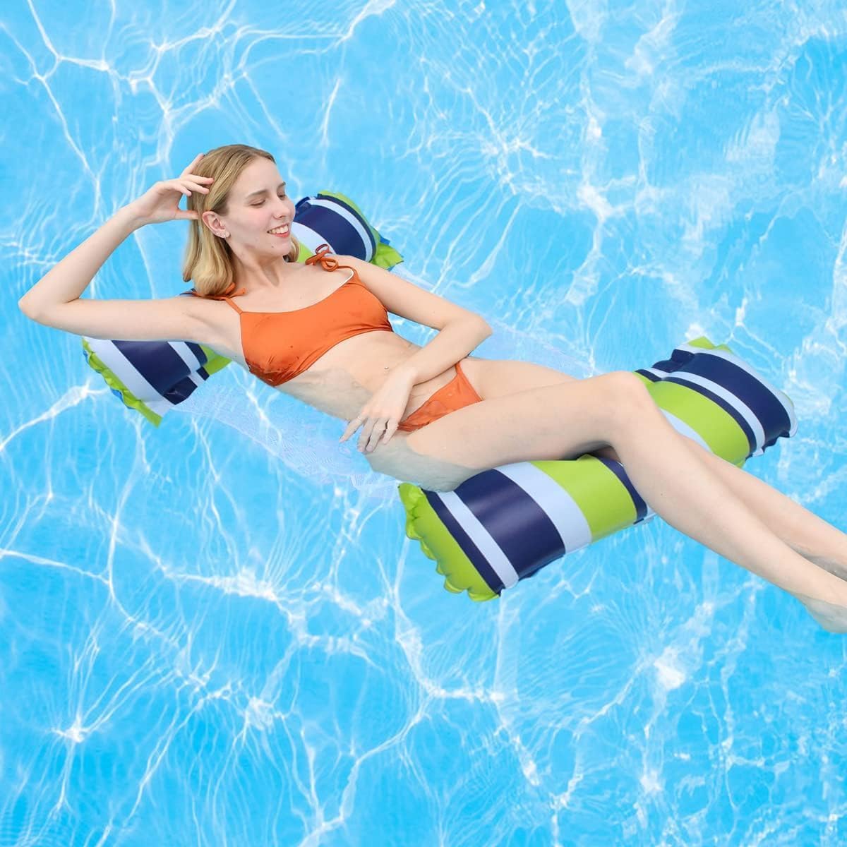 【カラー】 ブルー ピンク ネイビー グリーン イエロー オレンジ ブルー+イエロー 虹色 材質:PVC+ナイロン 生産国:中国 【この商品について】 【水上でハンモックのようにユラユラできるウォーターハンモック】 ボートでも浮き輪でもない、プールや海などの水上でユラユラ寝転がれるウォーターハンモックです。メッシュ生地の両端に丸太のようなフロートが付いています。メッシュの上に乗るので、程よく沈んで水を感じることが出来るので、とても気持ち良いウォーターハンモックです。 【ボディがメッシュなので沈むように浮くウォーターハンモック】 浮き輪のように身体が完全に水につかるのではなく、ボートのように水に触れない訳でもありません。浮力のあるメッシュ生地に乗るので、程よく水につかります。程よく水を感じられるので、程よく気持ちが良いウォーターハンモックです。 【空気を入れる量が少ないウォーターハンモック】 ボートや浮き輪に空気を入れる作業は、とても大変です。でも、このウォーターハンモックは、空気を入れる量がとても少ないので、準備で疲れることなく、スグに海やプールに入ることが出来ます。 【メッシュ生地なので沈没しない】 一般的なボートと違って、メッシュなので水が溜まることがありません。つまり、ボートのように沈没することがありません。 ※簡易包装となりますのでご理解の程よろしくお願いします。 ※手動測定による1・3cmの測定偏差を許容してください。 ※モニターや光の効果が異なるため、実際の色は写真の色と若干異なる場合があります。 ※仕様・デザインは改良のため予告なく変更することがあります。 メーカー希望小売価格はメーカーカタログに基づいて掲載しています