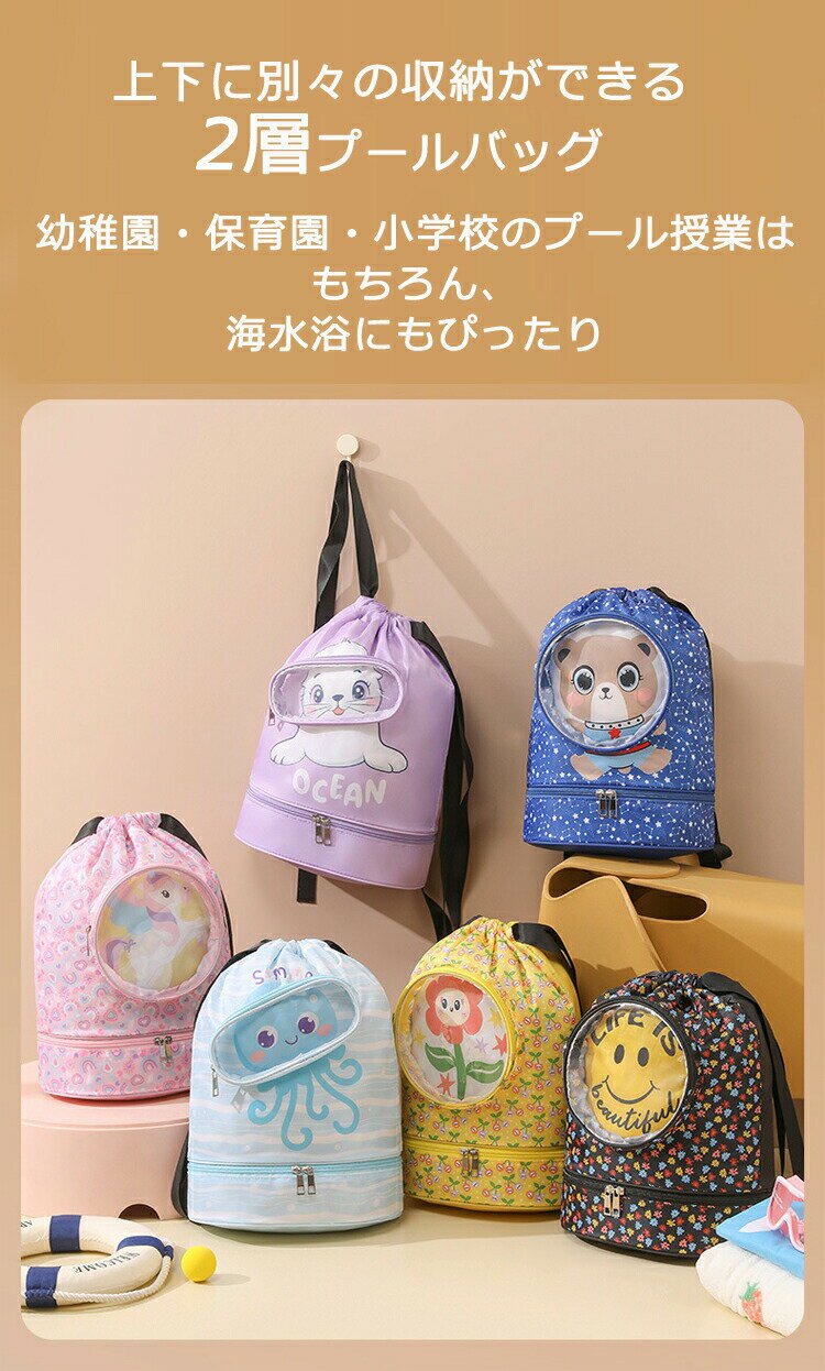 送料無料 プールバッグ 女の子 男の子 ビーチバッグ 軽量 リュック型 スイミングバッグ ナップサック 2層式収納 防水 プール 水泳 水着収納 保育園 幼稚園 小学生 低学年 小学校 中学生