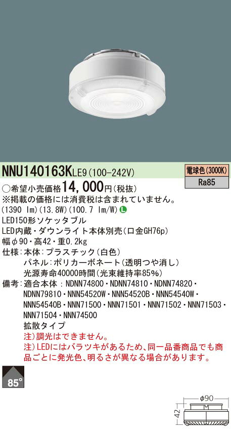 βパナソニック 照明器具【NNU140163KLE9】SB150形30K拡散Ra85 {V}