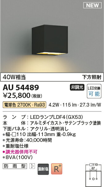 βコイズミ 照明【AU54489】エクステリア ポーチ灯 LED交換可能 非調光 電球色 40W相当 防雨型 重耐塩仕様 下方照射 サテンブラック