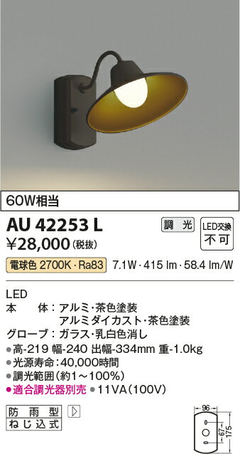 βコイズミ 照明【AU42253L】エクステリア ポーチ灯 LED一体型 調光 電球色 60W相当 防雨型 茶色 適合調光器別売