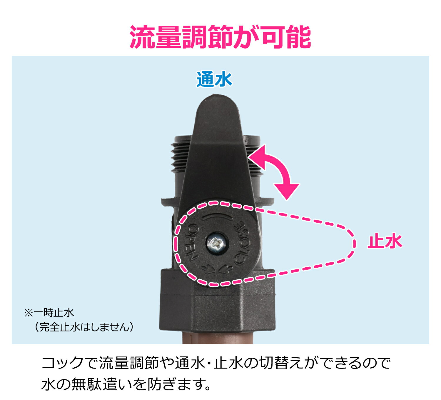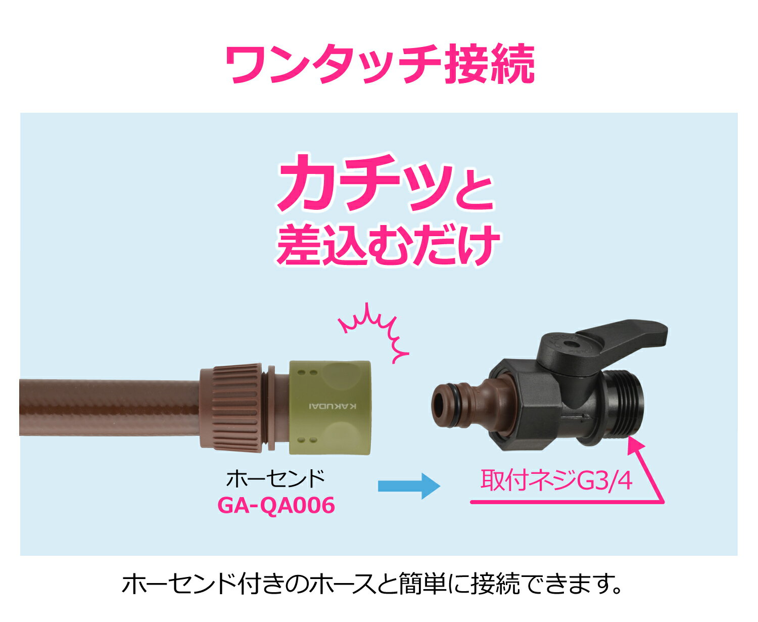 在庫状況:お取り寄せ(詳しくはこちらをクリック) 畑やビニールハウス、芝生など広範囲の水やりに便利な散水チューブ用の接手です。 ◆ワンタッチで散水チューブと接続し、コックで流量調節、通水・止水の切替えができます。 ◆取付ネジサイズ:G1/2 ◆散水チューブは別途GA-QF055(5m)、GA-QF056(10m)、GA-QF057(50m)をお求めください。 ◆自動水やり器と一緒に使用することで、水やりの手間が解消され、農作業の負担軽減になります。 ◆農業施設やマンション・アパートなどの植栽(植え込み)など大規模散水にオススメです。 ◆大がかりな工事が必要なく、簡単なDIYで日々の水やりを効率化し楽にできます。 ◆色は地面や草木などの自然に溶け込みやすく目立たないブラウンカラー(茶色)です。 ※コック部分での止水は完全止水ではありません。止水したまま放置しないでください。