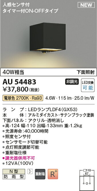 βコイズミ 照明【AU54483】エクステリア ポーチ灯 LED交換可能 非調光 電球色 40W相当 N型 防雨 重耐塩仕様 下方照射 人感センサ付 タイマー付ON-OFF