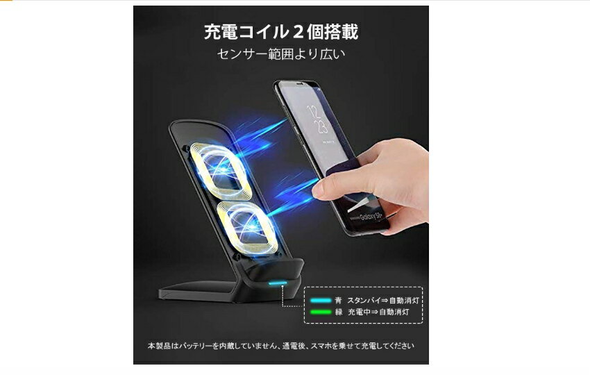 ◆商品名:ワイヤレス充電器 最大15W出力 急速 無線充電器 (Qi認証) iPhone 15/14/13/12シリーズ SE第二世代/8(Plus)、Galaxy S24/S23/S22/S21(Ultra)/S20/Note20、Xperia 1 IV/III/II 他のQi機種対応 置くだけ充電 日本語取扱説明書付 男性/女性 お誕生日プレゼント お中元 夏ギフト 黒 「より早い充電速度」:ワイヤレス給電の国際標準規格 Qi(チー)に対応し機器で、出力QC3.0/2.0(出力10W以降)アダプターで接続してから、iPhone 8以上またSamsung製たワイヤレス充電GalaxyシリーズなどのQi対応スマホ機種は乗せるだけで急速な充電をスタートします。従来の5W充電アダプターと比べ、充電速度を50%向上するため、充電時間が最大で30分短縮されます。※本製品はバッテリーを内蔵していません。正常に充電できるよう、出力5V/2A(10W)のQC/PDタイプのアダプターをご利用ください。 「広い互換性」:Qi受信機を内蔵されている機種はほとんど対応できます。iPhone 15シリーズ機種から14/13/12シリーズ、SE (第2世代) /11/11Pro Max/Xs/Xr/Xs Max/X/8/8 Plus、Galaxy S24(Ultra)/S23(Ultra)/S22(Ultra)/S21(Ultra)/S20/S10/S10+/S9/S9+/Note 8/S8など対応以外、Xperia xzシリーズも対応できます。Qi機能を搭載していない機種はこのまま乗せると、インジケーターが点滅して充電できません。互換性について、もし判断できない場合、インジケーターの点灯状態をご確認ください。別売りのQiレシーバーと併用した上、ワイヤレス充電を実現可能です。(ご注意:iPhone13シリーズのカメラは充電を干渉しませんが、ぜひ出力5V/2A(10W)以降のアダプターをお使いください。Xperia xz2/xz2 premium/xz3は横置き/逆置きで充電必要です) 「より高い安定性」:人間工学に基づいて、使用中に縦と横両方向置いても、目と手に相応しい角度をデザインとして、スマホトレイと底面に滑り止めゴムが付いています。安定性を高めた上に、スマホにも傷つけません。厚さ5mm以下(iPhone12シリーズは3mm)、非金属製のケースを付けても、このまま置いて充電可能です。(お薦め:本製品はFOD異物検査機能を搭載しています。スマホカバー以外の金属製、磁気を帯びる飾りや、クレジットカードを付けた場合、充電前に取り外して下さいますようお願い致します) 「LEDライトで充電ステータスを把握できる」: 充電が開始されると青いランプが10秒間光り、その後消灯します。充電が完了すると青いランプが5秒間光り、その後消灯します。充電中に点滅や光らないので、寝室に設置しても、睡眠に邪魔せず、良い睡眠を頂けます。