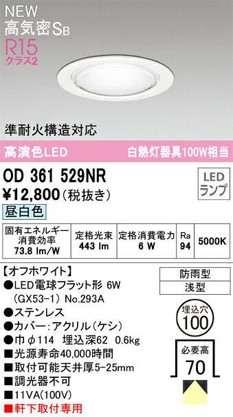 【代引・後払い不可】【OD361529NR】オーデリック エクステリアライト LEDランプ 演色性(Ra):94 埋め込み穴:φ100 昼白色 LED照明高気密SB 高演色LED 白熱灯器具100W相当 昼白色 消費電力6W Ra94 【オフホワイト】 ●LED電球フラット形 6W(GX53-1) No.293A ●テンレス●カバー:アクリル(ケシ) ●巾φ114 埋込深62 0.6kg ■光源寿命40000時間 ■取付可能天井厚5-25mm ■調光器不可 ■軒下取付専用 防雨型 浅型 その他 ベース_拡散この商品のメーカーへのお問い合わせはコチラ → ご不在時の商品配達のご連絡のため、電話番号はなるべく携帯電話の番号を入力してください。