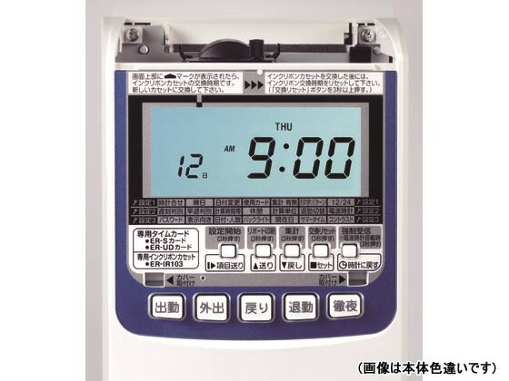 【仕様】昼休みなど途中の外出・戻りも管理できる1日4回打刻、さらに月間集計も可能。日をまたぐ場合も前日打刻ができるよう、徹夜ボタンを装備。重ね打ち防止機能搭載。縦・横置き、壁掛け対応。時計表示は置き方に合わせて回転します。地下などの電波の届きにくい場所でも、電波ユニットを外して受信可能な場所へ移動、本体へ戻すだけで、正確な時刻を維持できます。●電波時計搭載●1日4欄●黒印字●サイズ:幅140×奥行99×高さ230mm●重量:1.7kg●使用可能人数:集計時/60名、打刻のみ/150名●印字内容:出退4回/出退2回+日毎集計/出退2回+日毎累計/出退2回+日毎集計+日毎累計●適応タイムカード:ER−Sカード、ER−UDカード(2欄(出退2回)印字のみ対応・集計はできません) ※併用はできません●適応インクリボン:ER−IR103●付属品:取扱説明書、設定確認カード1枚、壁掛け用ネジ2個 ※タイムカードは付属していません●バックライト付LCDモニター●主な機能:重ね打ち防止機能、徹夜ボタン、退勤切替、パスワード設定機能、設定確認機能、インクリボン交換お知らせマーク●サマータイム対応可●保証期間:3年●本体色:ブラック【検索用キーワード】MAX まっくす デンパドケイツキ でんぱどけいつき たいむれこーだ ER−110SUW ER110SUW ER90721 電波時計搭載 本体 4欄印字 集計機能付 電波時計付 60人 60名 150人 150名 ER−Sカード UDカード ER−IR103 着脱式電波時計ユニット タイムレコーダー RPUP_02 R42366集計機能を充実、締め後もぐっと効率的に。電波時計搭載。