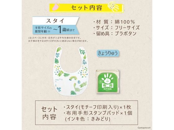 【商品説明】背景があらかじめプリントされており、手形・足形をおすだけで誰でも簡単に可愛いグッズが制作できます。【仕様】●柄:きょうりゅう●インキ色:きみどり●セット内容:●サイズ(スタイ):210×295mm●材質(スタイ):綿100%※柔軟剤抜き●インキ盤面サイズ:80×80mm●水性顔料インキ[布用手形スタンプパッドの特長]インキは肌に優しく、水洗いや濡れたティッシュなどで簡単に洗い落とせます。※欧州玩具規定 EN71−3(特定元素の移行)に適合[パッチテスト済み]約50回の手形を取ることができます。(当社試験データ)※手のひらの大きさや使用状況・環境により回数は異なります。※小さなお子様がご使用する場合は、必ず保護者の方と同伴の上でご使用ください。※肌についたインキは、スタンプした後に素早く洗い流してください。※本品のインキには安全な材料を使用していますが、食べ物ではありませんので舐めないでください。※インキが目に入ったときは、すぐに大量の水で洗い流し、医師の診断を受けてください。※万一、手や足にかゆみが出たり、赤くなったりする症状が現れた場合は直ちに使用をやめて、石けんで洗い流してください。かゆみがひかない場合は、医師の診断を受けてください。※インキは顔や衣服に付かないよう、充分に注意してください。※インキの補充はできません。【備考】※メーカーの都合により、パッケージ・仕様等は予告なく変更になる場合がございます。【検索用キーワード】シヤチハタ シャチハタ しやちはた shachihata パームカラーズ PALM COLORS PALMCOLORS First Art FirstArt ファーストアート ふぁーすとあーと スタンプ台 手形 足形 てがた あしがた 手形足形 水性顔料 よだれかけ すたい HPFK−ST H−3 HPFKSTH3 赤ちゃん あかちゃん ベビーグッズ ベビー用品 子供 思い出 おもいで 記録 成長記録 布用スタンプ 安心 安全 手洗い 洗濯 セット キット 出産祝い ギフト 記念 記念品 メモリアル 0歳 1歳 スタンプ スタンプ雑貨 RPUP_02お子様の手形・足形でオリジナルの「スタイ」を作ることができる制作キット。