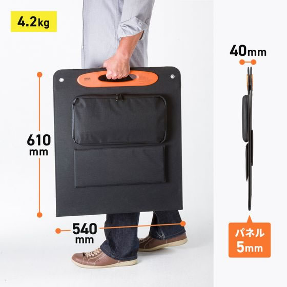 【商品説明】サンワサプライ製ポータブル電源(BTL−RDC23)に接続して使えるソーラーパネルです。効率の良いSunPower社製単結晶シリコンパネルを採用しています。パネルは特殊フッ素樹脂コーティングETFEを採用し耐久性、防水、防塵、耐候性に優れています。USB充電ポート付き(A×1、C×1)でバッテリーなしでスマートフォンへ充電が行えます。ハンドル付きで持ち運びに便利です。【仕様】●USB出力ポート数:2ポート(USB Type−C×1、USB A×1)●USB定格出力電圧/電流:USB Type−C 5V/3A、9V/2A、12V/1.5A(最大18W)USB A 5V/3A、9V/2A、12V/1.5A(最大18W)●USB PD:対応●USB出力端子形状:USB A、USB Type−C●USB PD最大対応出力:18W●使用温度範囲:0〜40℃●USB合計最大出力:36W●サイズ:約幅540×奥行40×高さ610mm(収納時)●重量:約4.2kg●ケーブル長:約2m●パネル種類:単結晶シリコンパネル●公称最大出力:100W●公称最大出力動作電圧:17.6V●公称最大出力動作電流:5.68A●公称開放電圧:21.12V●公称短絡電流:6.19A●ケーブル出力端子形状:MC4コネクタ●セット内容:ソーラーパネル、取扱説明書・保証書●※AM1.5、放射照度1000W/平方メートル、モジュール温度25℃条件での値です。※実際の出力値は日射の強さ、設置条件(方位・角度・周辺環境)、地域差、および温度条件により異なります。【備考】※メーカーの都合により、パッケージ・仕様等は予告なく変更になる場合がございます。【検索用キーワード】サンワサプライ さんわさぷらい SANWASUPPLY ポータブルソーラーパネル100W ポータブルソーラーパネル 100W ソーラーパネル BTL−SP1 BTLSP1 100W 折り畳み式 BTL−RDC23 BTLRDC23 SunPower社製 単結晶シリコンパネル採用特殊フッ素樹脂コーティングETFE採用 耐久性 防水 防塵 耐候性 スマートフォン 充電 電池 充電器 充電池 BCP BCP対策 防災 防災グッズ 災害 災害グッズ 防災用品 災害対策 bousai0103 R3491C最大100Wの出力に対応した折り畳み式ソーラーパネル。BTL−RDC23に対応。