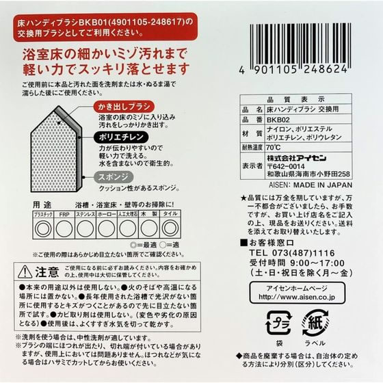 【商品説明】軽い力でお風呂の床のミゾ汚れまでスッキリ落とせるハンディブラシです。水を吸わない素材のため、衛生的に使用することができます。浴室の床、浴槽、壁等のお掃除に便利です。別売りの【BKB01 床ハンディブラシ】の交換用としてお使いください。【仕様】●本体サイズ:W100×D20×H180mm●耐熱温度:70℃●材質:ナイロン、ポリエステル、ポリエチレン、ポリウレタン●生産国:日本●内容量:1個【備考】※メーカーの都合により、パッケージ・仕様等は予告なく変更になる場合がございます。【検索用キーワード】アイセン あいせん aisen 床ハンディブラシ交換用 床ハンディブラシ 交換用 床 ハンディ ブラシ 交換 バスブラシ 浴室用ブラシ 床ブラシ ブラシ 浴室用 お風呂用 床清掃 浴室清掃 浴室掃除 床 浴室 掃除 清掃 BKB02 清掃用品 掃除道具 R326KJお風呂の床に!