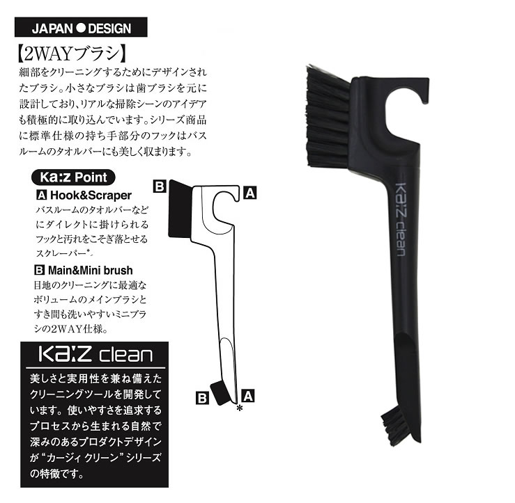 KAZCLEAN 2WAYブラシ カージィクリーン 日本クリンテック(株) 仕様 サイズ:約W6.5×D2×H21cm。 材質:毛/PET樹脂 ハンドル/ポリプロピレン。 原産国:中国 ※WEB上のため、実物と画像とで色など、多少違う点がございますのでご理解ください。 ※商品仕様・サイズ等は変更する場合があります。 ※ご注文日より通常5営業日以内に発送(土日祝日を除く)となります。 商品の特徴 デザイン&機能性にすぐれたお掃除道具。 目地のクリーニングに最適なボリュームのメインブラシとすき間も洗いやすいミニブラシの2WAY仕様。 細部をクリーニングするために本格的にデザインされたブラシです。 持ち手部分のフックはバスルームのタオルバーにも美しく収まります。 汚れをこそぎ落とせるスクレーパー付き。 にぎりやすいグリップ、 ブラシ部分も固すぎずちょうどいい。 カラバリ豊富3色展開。計算されたサイズ。 モダンなブラック・ホワイト・レッドがカッコいい。 楽しくなるお風呂掃除用具(風呂 掃除 ブラシ バス カビとり お風呂用掃除用品 バスタブ洗い バスクリーナー お風呂掃除 風呂スポンジ 掃除用品 カビ取り カビ対策 バス掃除用ブラシ)かんたん キレイ 風呂場 水切り スリッパ モップ いす せっけんおき おしゃれ KAZCLEAN スキ間掃除 すき間 スキマ 掃除 隙間 そうじ 季節の贈り物に 父の日 母の日 敬老の日 孫の日 御中元 敬老の日 ハロウイン クリスマス 冬ギフト お歳暮 お年賀 お正月 年末年始 バレンタイン ホワイトデー 日々の心づかい、ちょっとした手みやげに 御祝 御礼 御挨拶 粗品 お使い物 贈答品 ギフト プレゼント お土産 手土産 贈りもの 進物 お返し お祝いや内祝いなど祝儀の品に 引き出物 お祝い 内祝い 結婚祝い 出産祝い 引き菓子 快気祝い プチギフト お誕生日 七五三 進学内祝 入学内祝にぎりやすいグリップ、 2WAYブラシで目地や細かい間の掃除に大変便利! モダンなカラーバリエーション・デザインで、毎日のお掃除が楽しくなります! フック裏のスクレイパーで、さらに細かいかきだし掃除に大変便利です! フックをタオルバーなどに引っ掛けることができ美しく収納できます! カッコよくて使いやすいから、全部シリーズでほしくなる! とりあえずお一つ試してみて下さい、毎日楽しくピカピカお掃除♪