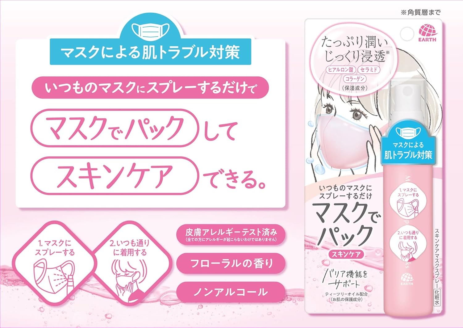 アース製薬 マスク用 スプレー 化粧水 マスクでパック スキンケア 保湿 50ml アレルギー 花粉対策 マスク用スプレー メイクキープ スキンケア スキンケアスプレー 夏対策 ヒアルロン酸 コラーゲン 化粧水 マスクスプレー ノンアルコール 携帯用 フローラルの香り SNS話題