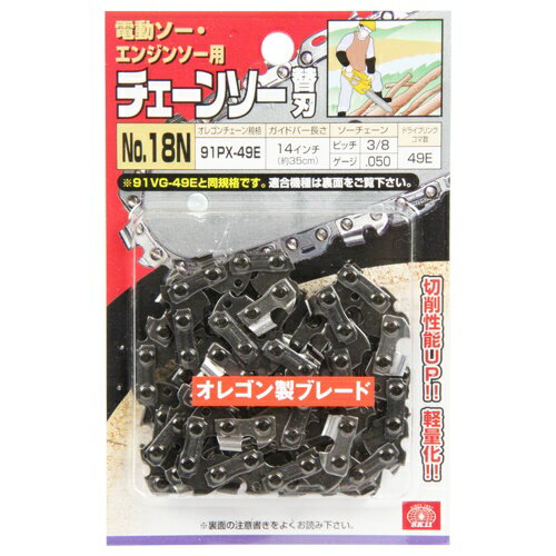 SK11(エスケー11)の一覧はこちら切れ味が鋭く、キックバック軽減機能付き、軽量化チェーンです。【用途】チェーンソー用の交換用替刃。【機能】旧製品91VGに比べ軽量化をはかり、さらに作業効率もアップしました。キックバックを防ぐバンパータイストラップを廃止し、さらに刃付け法を改良した事で切削性能が9パーセントアップしました(91VGとの比較)。新設計のバンパードライブリンクによってキックバックを減少させ、米国安全基準のANSI・B175.1に合致してます。刃持ちが良く、お手入れも簡単なので長くご愛用いただけます。山林作業や造園作業、趣味の木材加工に適してます。【仕様】●オレゴンチェーン規格:91PX-49E。●ガイドバーの長さ:14インチ(約35cm)。●ピッチ:3/8・ゲージ:.050。●ドライブリンクコマ数:49E。●ブルースチール加工。【材質】●鉄鋼材。【注意事項】お求めの際は必ず、お持ちの機種のチェーン番号とガイドバーの長さをご確認ください。チェーン刃の交換は必ずエンジンを停止して行ってください。使用中は保護メガネ、保安帽、防振手袋など安全具を着用してください。跳ね返り(キックバック)には十分注意してください。【商品サイズ】縦(mm) 7横(mm) 350高さ(mm) 70【商品重量】重量(g) 160JANCD:4977292386906【メール便対応】その他、配送方法をお選び頂く事は出来かねます。合計金額による送料無料対象外の商品です。【銀行振込・コンビニ決済】等前払い決済予定のお客様へ当商品は弊社在庫品ではなく、メーカー在庫品です。在庫確認後に注文確認を行い、お支払いのお願いを送信させて頂きます。休業日、14:00以降のご注文の場合は翌営業日に上記手続きを行います。お時間が掛かる場合がございます。