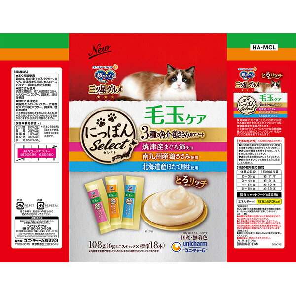 ユニ・チャーム 銀のスプーン三ツ星グルメおやつにっぽんSelectとろリッチ毛玉ケア3種のアソートまぐろ&鶏ささみ&ほたて108g