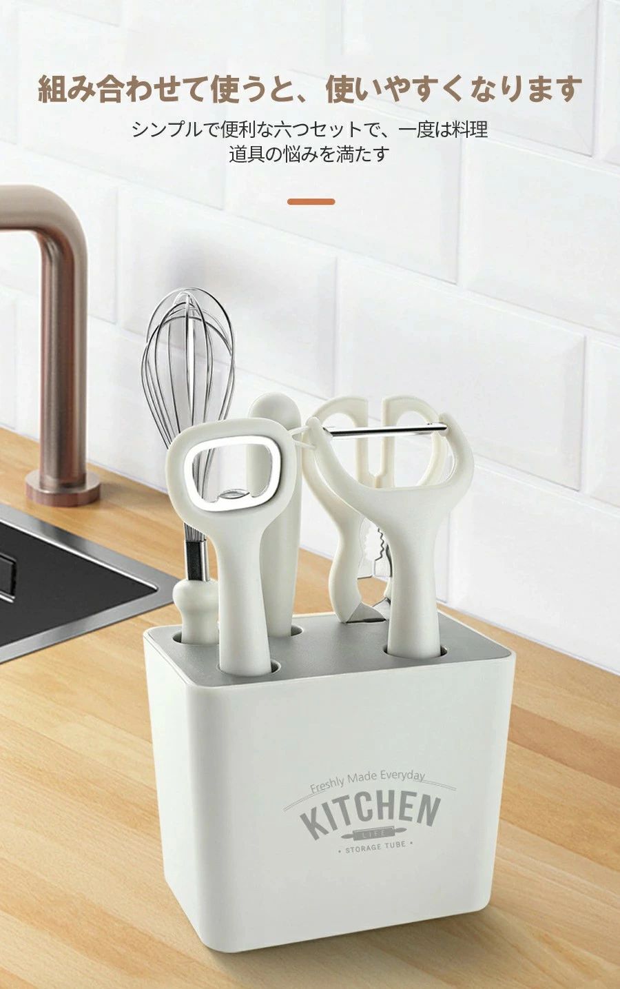 キッチンツール 商品情報 キッチン用品セット: 当社の調理器具セットは、完璧な料理体験のために必要なものがすべて揃っています。 一つ一つ一つ買って大金を費やす必要はありません。 泡立て、ピーリング、カッティング、攪拌、ミキシングなど、色々食品準備を手助けするために特別に設計されています。 長持ちするようにデザインされた高品質キッチンツール: 錆びたりするキッチン用品を心配する必要はもうありません。食用レベルのシリコーンとステンレススチールで作られて、BPAフリーなので、直接食品に接触でき、ご心配なく毎日楽しみます。 収納しやすい、省スペース:専用収納ケースが付きておりますので、カードスロットとフィルターの設計があって、逆さまになって水にしみ込むことを恐れないで、収納が便利で衛生的です。また、台を汚すストレスや片づけの手間から解放されて便利です。 調理用具セットの内容: フルーツかんな 泡立て器 キッチンはさみ 栓抜き ナイフ 収納ケース