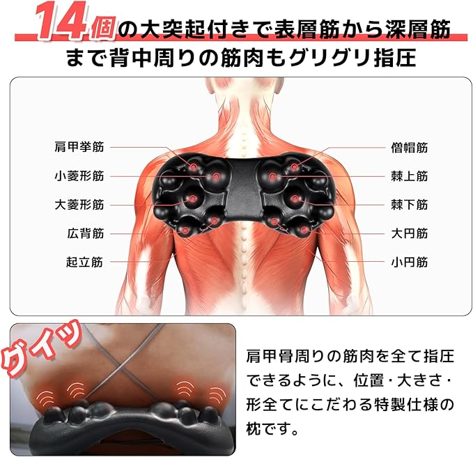 商品情報背中 スッキリ気持ちいい長時間のデスクワークやスマホの使用時、背中が知らず知らずのうちに前傾していませんか。この肩甲骨ストレッチ枕 をお勧めします。枕を使って 肩甲骨 をしっかり伸ばし、指圧部分で背中と肩をリラックスさせることができ、短い空き時間でも簡単に使用できるツボ押し器具です。肩甲骨ストレッチ枕肩胛骨はがし 体にピッタリフィットし、肩、背中、肩甲骨を伸ばすことができるツボ押し器具です。肩甲骨はがし ピロー 整体師の手技を再現し、肩甲骨の部分をリラックスさせることができます!人体構造に基づいた設計肩甲骨 ストレッチ 「床でストレッチを行うことで、背中と肩甲骨を深く伸ばすことができます。自身の体調に合わせてストレッチを行うことをお勧めします。」14個の突起部分があり、肩甲骨周りの筋肉をしっかりと圧迫します。毎日5分の肩甲骨ストレッチ肩甲骨はがし器具 毎日5〜10分、休憩の合間に。床に置いて寝るだけで背中をストレッチできます。14個の突起部分でツボを指圧。背中を刺激し、簡単にストレッチできます。毎日1分1セットから始め、慣れてきたら回数と時間を徐々に増やしていきます。ストレッチバンドとタオル付き寝てからまたチューブでストレッチして、徹底的に肩甲骨周りストレッチが実現!突起の刺激が強い時に使用するタオルも付属しています。ギフトにも最適肩甲骨はがし グッズ 仕事の後、入浴後、またはテレビを見たりスマホを使ったりする短い空き時間に簡単に使用できる背中のツボ押し器具です。また、背中のツボ押しギフトとして、誕生日、記念日、父の日、母の日の健康ギフトとしても非常にお勧めです。肩甲骨はがし ピロー 肩胛骨はがしピロー 肩胛骨はがし 肩甲骨 ツボ押し ストレッチ 背中 腰 首 健康器具 健康グッズ ストレッチバンド 付き 肩甲骨はがし ピロー 肩胛骨はがしピロー 肩胛骨はがし 肩甲骨 ツボ押し ストレッチ 背中 腰 首 健康器具 健康グッズ ストレッチバンド 付き 長時間のデスクワークやスマホの使用時、背中が知らず知らずのうちに前傾していませんか?この肩甲骨ストレッチ枕 をお勧めします。枕を使って 肩甲骨 をしっかり伸ばし、指圧部分で背中と肩をリラックスさせることができ、短い空き時間でも簡単に使用できるツボ押し器具です。肩胛骨はがし 体にピッタリフィットし、肩、背中、肩甲骨を伸ばすことができるツボ押し器具です。肩甲骨はがし ピロー 整体師の手技を再現し、肩甲骨の部分をリラックスさせることができます!肩甲骨 ストレッチ 「床でストレッチを行うことで、背中と肩甲骨を深く伸ばすことができます。自身の体調に合わせてストレッチを行うことをお勧めします。」14個の突起部分があり、肩甲骨周りの筋肉をしっかりと圧迫します。肩甲骨はがし器具 毎日5〜10分、休憩の合間に。床に置いて寝るだけで背中をストレッチできます。14個の突起部分でツボを指圧。背中を刺激し、簡単にストレッチできます。毎日1分1セットから始め、慣れてきたら回数と時間を徐々に増やしていきます。肩甲骨はがし グッズ 仕事の後、入浴後、またはテレビを見たりスマホを使ったりする短い空き時間に簡単に使用できる背中のツボ押し器具です。また、背中のツボ押しギフトとして、誕生日、記念日、父の日、母の日の健康ギフトとしても非常にお勧めです。寝てからまたチューブでストレッチして、徹底的に肩甲骨周りストレッチが実現!突起の刺激が強い時に使用するタオルも付属しています。 5