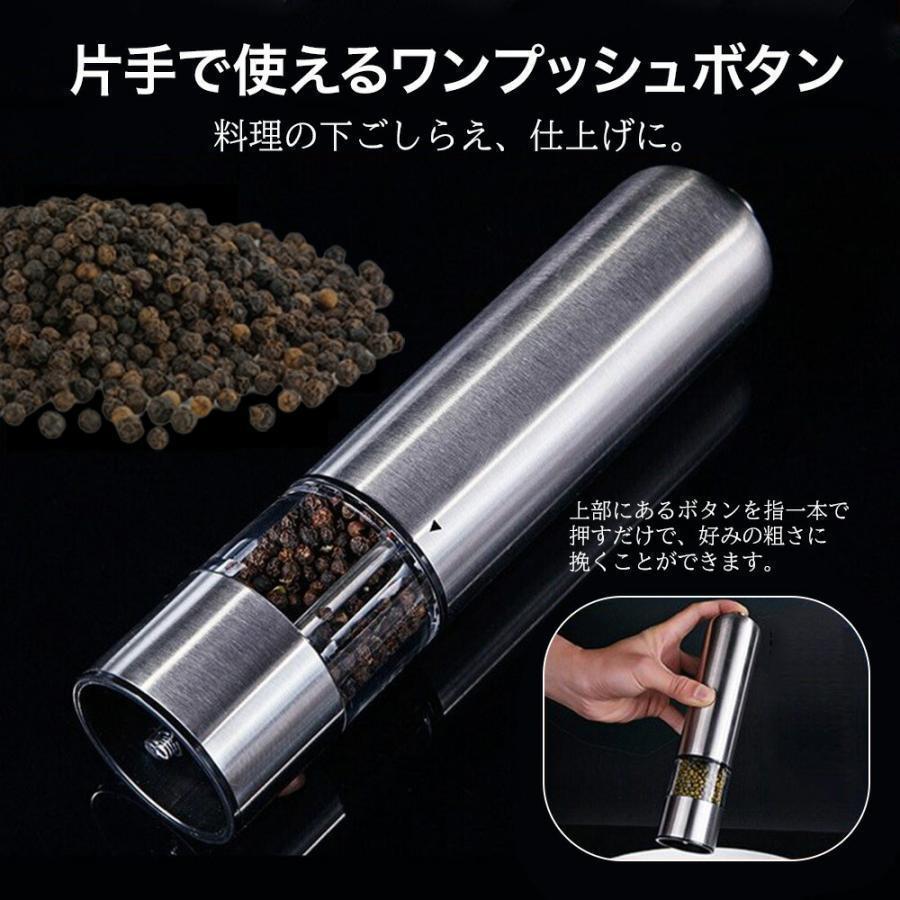 ステンレス製の電動式『ソルト&ペッパーミル』胡椒などの香辛料を入れてボタンを押すだけで自動的に研磨致します。使い勝手がよく、労力や時間の節約にもなって一石二鳥です!研磨の粗さを調整できますので、お好みの削り方をお選びいただけます。胡椒、結晶塩、岩塩などが適です。お料理をする際の調味料の準備にも重宝いたします。 ステンレス製でサイズが『5.2 cm x 22.5 』cm エレガントでスタイリッシュなデザインに定評があります。モダンでおしゃれなキッチンのインテリアとしてもオススメの調理器具です。家庭用?業務用どちらにも相性が良いです。高品質のステンレススチール製品なので、頑丈な構造?耐久性があり長持ちします。商品仕様本体サイズ:53x225mm本体重量:300g機能:ライト付き、6段階調節 電源:単三電池×4個(別途)材質容器:ステンレススチール18/0キャビン:AS内部品:ABSグラインダー:セラミック特長ペッパー、スパイスミル、塩、コショウ、こしょう、ワンプッシュ、LED付き、スタイリッシュ(製品には電池が含まれていません)ステンレス製の電動式『ソルト&ペッパーミル』胡椒などの香辛料を入れてボタンを押すだけで自動的に研磨致します。使い勝手がよく、労力や時間の節約にもなって一石二鳥です!研磨の粗さを調整できますので、お好みの削り方をお選びいただけます。胡椒、結晶塩、岩塩などが適です。お料理をする際の調味料の準備にも重宝いたします。 ステンレス製でサイズが『5.2 cm x 22.5 』cm エレガントでスタイリッシュなデザインに定評があります。モダンでおしゃれなキッチンのインテリアとしてもオススメの調理器具です。家庭用?業務用どちらにも相性が良いです。高品質のステンレススチール製品なので、頑丈な構造?耐久性があり長持ちします。商品仕様本体サイズ:53x225mm本体重量:300g機能:ライト付き、6段階調節 電源:単三電池×4個(別途)材質容器:ステンレススチール18/0キャビン:AS内部品:ABSグラインダー:セラミック特長ペッパー、スパイスミル、塩、コショウ、こしょう、ワンプッシュ、LED付き、スタイリッシュ(製品には電池が含まれていません)