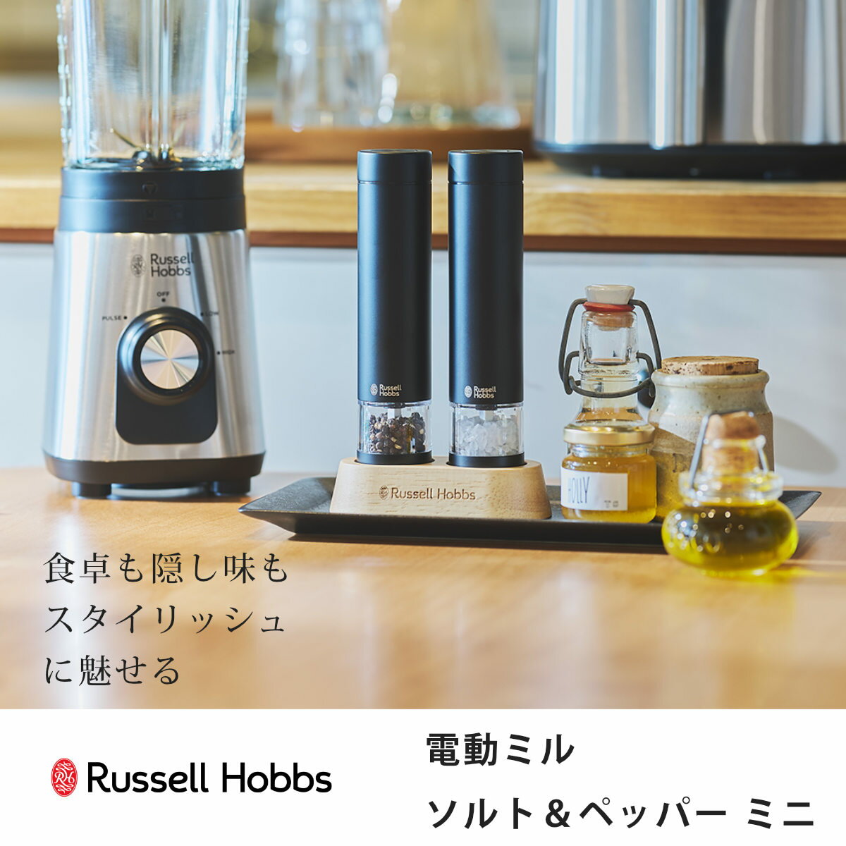 Russell Hobbs 電動ミル ミニ 2本セット 木製スタンド付き ソルト&ペッパーミル ( ラッセルホブス ミル 2個 電池式 ソルトミル ワンプッシュ セラミック刃 ウッドスタンド付き 小さめ 胡椒 岩塩 )【3980円以上送料無料】