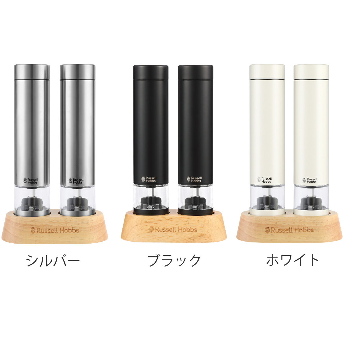 サイズ約 幅11.5×奥行6×高さ18(cm)本体1本のサイズ:約 直径4×高さ18(cm)重量約 450g本体1本の重量:約 200g内容量2本セット付属品:ウッドスタンド材質ステンレス、セラミック、PCTG樹脂、ABS樹脂種類シルバー、ブラック、ホワイト生産国中国製電源1.5V 単4乾電池4本注意事項※乾電池は別売りです。※マンガン乾電池は使用できません。※充電式乾電池は使用できます。※商品ページ内にはリニューアル前の商品を含む画像を使用しています。区分返品・キャンセル区分(小型商品)ギフトラッピングページを見るRussell Hobbs 電動ミル ミニ 2本セット 木製スタンド付き ソルト&ペッパーミルおすすめポイント※商品ページ内にはリニューアル前の商品を含む画像を使用しています。ブランド紹介世界で愛される英国の調理家電ブランドラッセルホブス(Russell Hobbs)は、1955年にお湯が沸騰すると自動的に電源が切れる「自動電源OFF機能」を搭載した世界初の電気ケトルを生み出しました。パンを美味しく焼き上げるトースターの新機能など、ケトル以外にも独創的な製品を数多く開発し、日本に上陸後はJAPANオリジナルの「カフェケトル」なども誕生。シンプルでスタイリッシュなキッチン家電が、あなたの暮らしに豊かさをもたらします。商品詳細摩擦熱が少なく、挽きたての香りを保つサビの心配がなく、岩塩にも使用できる丈夫なセラミック製の刃を使用しています。摩擦熱が生じにくい材質のため、熱で飛びやすい胡椒の香りを保ちます。電池式でどこでも使える電池式乾電池(1.5V単4乾電池×4本)で持ち運びができるので、アウトドアにも最適です。キャンプやピクニックなど、外出先でも一味プラスしたいときにおすすめです。※乾電池は別売りです。※充電式乾電池も使用可能です。おしゃれな木製スタンドつき付属のウッドスタンドにミルを立てることによって、ミルが転倒するのを防いでくれます。また、グラインダー部に残る細かなコショウや塩がテーブルなどに散って汚れないように、受け皿の役割にもなります。おしゃれなラッセルホブスの電動ミルは、新生活を始めるご家族・ご友人への応援プレゼント、引っ越し祝い・結婚祝いのギフトにもおすすめです。商品画像ご注意点乾電池(1.5V単4乾電池×4本)は付属いたしませんので別途ご用意ください。充電式乾電池も使用可能です。シリーズ紹介充電式 電動ミル ミニ 1本木台付き充電式 電動ミル ミニ 2本木台付き電動ミル 1本ソルト&ペッパー 2本ソルト&ペッパー2本 ウッドスタンドあわせて買いたい電動ミルミニ専用 キャリーポーチ■2025-11-17メーカーの仕様変更のため、ページをリニューアルしました。変更詳細:充電式乾電池の使用が可能キャビンに入る容量が約2割アップ関連キーワード:イギリス ブランド 電動 自動 調理 調理家電 キッチン家電 コンパクト ミニサイズ 小さい お洒落 ステーキ ツール 調理器具 キッチン用品 キッチン雑貨 キッチン小物 調理小物 調理用品 調理道具 台所用品 おすすめ 人気 便利 役立つ 片手で使える 片手で操作 キャンプ BBQ バーベキュー 黒 ボタン式 香辛料 ステンレス おしゃれ ペッパーミル RussellHobbs ラッセルホブズ ラッセル ホブス LH13090 関連商品はこちら Russell Hobbs 電動ミル ミニ 5,500円 Russell Hobbs 電動ミル 2本セ8,800円 Russell Hobbs 電動ミル 2本セ7,700円 Russell Hobbs 充電式 電動ミル8,800円Russell Hobbs 電動ミル ソルト&4,400円~ Russell Hobbs 充電式 電動ミル4,400円~ Russell Hobbs 充電式 電動ミル4,400円電動ミル 2本セット atomico ソルト&4,980円電動ミル 充電式 atomico 台付き ソル7,980円 BRUNO 電動スパイスミル ダブルオートス3,850円BRUNO 電動ミル LEDライト付 スパイス2,200円プッシュミル セラミック ソルト&ペッパー ミ1,770円