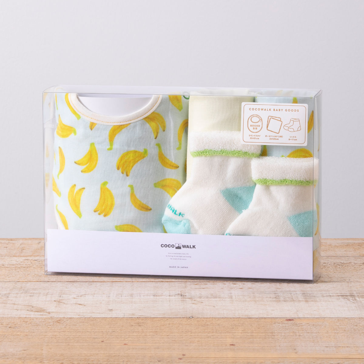 サイズスタイ:幅21×高さ25cm、ハンカチ:幅25×高さ25cm、ソックス(9〜11cm)6ヶ月〜9ヶ月※BOXサイズ:幅25×高さ17×奥行6cm内容量スタイ1枚、ハンカチ2枚、ソックス1ペア材質スタイ:綿100%、ハンカチ:綿100%、 ソックス:綿56% アクリル24% ナイロン15% ポリウレタン5%種類イチゴ、バナナ生産国日本製区分返品・キャンセル区分(小型商品)ギフトラッピングページを見る●可愛いフルーツ柄のスタイとハンカチ、ソックスのギフトセットです。●スタイとハンカチは肌にやさしい綿100%です。●スタイは横スナップボタンで着脱簡単です。●優しいガーゼ生地のハンカチです。●ソックスにはすべり止めがついています。●安心の日本製でプレゼントにおすすめです。おすすめポイント可愛いフルーツ柄のスタイとハンカチ、ソックスのギフトセットフルーツ柄のスタイ1枚とハンカチ2枚、ソックスが入ったギフトボックスです。使う頻度の高いもののセットなので、お母さん・お父さんにも喜ばれます。イチゴ柄とバナナ柄の2種類があります。スタイとハンカチは肌にやさしい綿100%スタイとハンカチは通気性が良く軽くて柔らかい綿100%のガーゼを使用しているので赤ちゃんの肌にやさしく安心です。吸湿性も良いので、汗やよだれも良く吸い取ってくれます。※ラトルはギフトセットには含まれません。商品詳細スナップボタンで着脱簡単なスタイ横スナップボタン式なので赤ちゃんがねんねしていても簡単に外せます。首回りのサイズに合わせて、2段階に調整可能です。赤ちゃんの汚れた口元を拭いたり、よだれや食べこぼし、飲みこぼししても服が汚れないように衣類を守ります。優しいガーゼ生地のハンカチハンカチはフルーツ柄と無地の2枚が入っています。その日のお洋服やシーンに合わせて使い分けができます。また、肌触りの良いガーゼハンカチなので、赤ちゃんの沐浴ガーゼや、お食事タイムのお手拭きとしてもおすすめです。すべり止め付きのソックスソックスの裏には白い星型のすべり止めがついており、安心です。サイズは9~11cmで、6か月~9か月ごろの赤ちゃんに合う大きさです。安心の日本製でプレゼントにおすすめ素材選びや縫製にこだわり国内で1つ1つ大切に作られた日本製です。中身が見えるクリアなボックスに入っているので、出産祝いやちょっとしたプレゼントにもおすすめです。カラーシリーズ紹介にぎにぎハンカチミニギフトBOXソックスギフトBOX関連キーワード:ガーゼハンカチ ミニハンカチ タオル コットン100% 手ふき 口拭き よだれ 汗拭き ベビースタイ 前掛け エプロン ビブ くつした 乳児 乳幼児 子供 こども 子ども 男児 女児 男子 女子 赤ちゃん用 ベビー用 ベビー用品 赤ちゃん用品 衛生用品 キッズ用品 子供用品 出産準備 ご出産 御出産 育児グッズ ベビーグッズ おしゃれ オシャレ お洒落 可愛い カワイイ おすすめ オススメ 人気 贈り物 お土産 お祝い お返し 返礼 果物 イチゴ いちご 苺 バナナ ばなな LH10082 LH9840 関連商品はこちらスタイ ハンカチ 靴下 セット ソックスギフト3,960円ギフトセット ソックス ギフトBOX レオレオ4,070円ギフトセット ソックス ギフトBOX はらぺこ4,070円ギフトセット ソックス ギフトBOX こぐまち4,070円ギフトBOX はらぺこあおむし スタイ ハンカ4,070円出産祝い ミニギフトBOX くだもの 女の子 2,530円ギフトセット ソックスギフトBOX やさしいガ3,960円スタイ ハンカチ セット ミニギフトBOX フ2,530円スタイ ハンカチ 靴下 ソックスギフトBOX 3,960円ギフトセット ミニギフトBOX レオレオニ ハ2,640円ミニギフトBOX はらぺこあおむし スタイ ハ2,640円ギフトセット ミニギフトBOX はらぺこあおむ2,640円