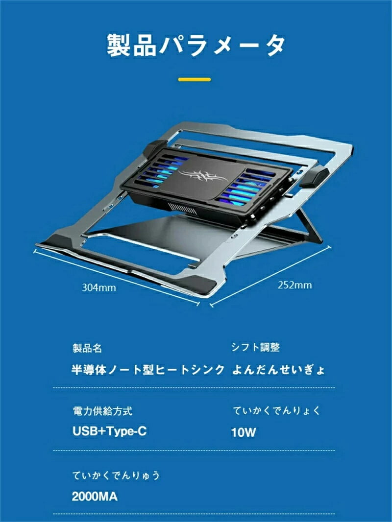 商品タイトル 【ハイパフォーマンス・クーリングスタンド】瞬間冷却技術・静音設計・角度調整可能・USB給電 商品説明 革新的な冷却機能: ペルチェ素子を搭載し、熱を素早く効果的に放出。内蔵の高性能ファンが冷却力をさらに強化し、ノートパソコンのパフォーマンスを最大限に引き出します。 エルゴノミックデザイン: 4段階の高さ調整が可能で、最適な視覚角とタイピング角度を提供し、長時間の使用でも快適です。 多機能性: 冷却だけでなく、デバイスのスタンドとしても機能。タブレットやノートPCに適応し、幅広いサイズに対応します。 持ち運びやすさ: 軽量でコンパクトなデザインのため、外出先や出張にも最適。いつでもどこでも快適に作業が可能。 静音作動: 高性能ファンは最大限の冷却を提供しながらも、騒音は極めて低く保たれ、集中を妨げません。 USB給電式: USBポートからの給電で、特別な電源アダプターは不要。どこでも簡単に使用できます。 主要スペック 電源:USB Type-C 5V/2A ファン数:2 冷却方式:半導体冷却システム+多層冷却材料 寸法:30.4 x 25.2 cm 重量:860g 対応サイズ:12インチ~17.8インチのノートパソコン 注意事項 防水性能はありませんので、水濡れにはご注意ください。 仕様やデザインは改良のため、予告なしに変更される場合があります。 この高性能クーリングスタンドで、長時間の作業も熱から解放され、より快適に。ゲームや映画視聴、重いタスクでもノートPCの性能をフルに活かしましょう! 注意事項 ※本体は防滴や防水ではありません。 ※本製品を使用する事により発生した事故、損傷、破損、損害等に関して弊社では責任を負いかねます。 ※測る位置によって、多少の誤差が生じる場合がございます。 ※製品のデザイン、仕様は改良のため予告なしに変更する場合があります。 ※掲載の商品画像と実際の色は、室内、室外での撮影の状況、モニターの表示等により若干異なる場合がありますので、ご了承くださいませ。