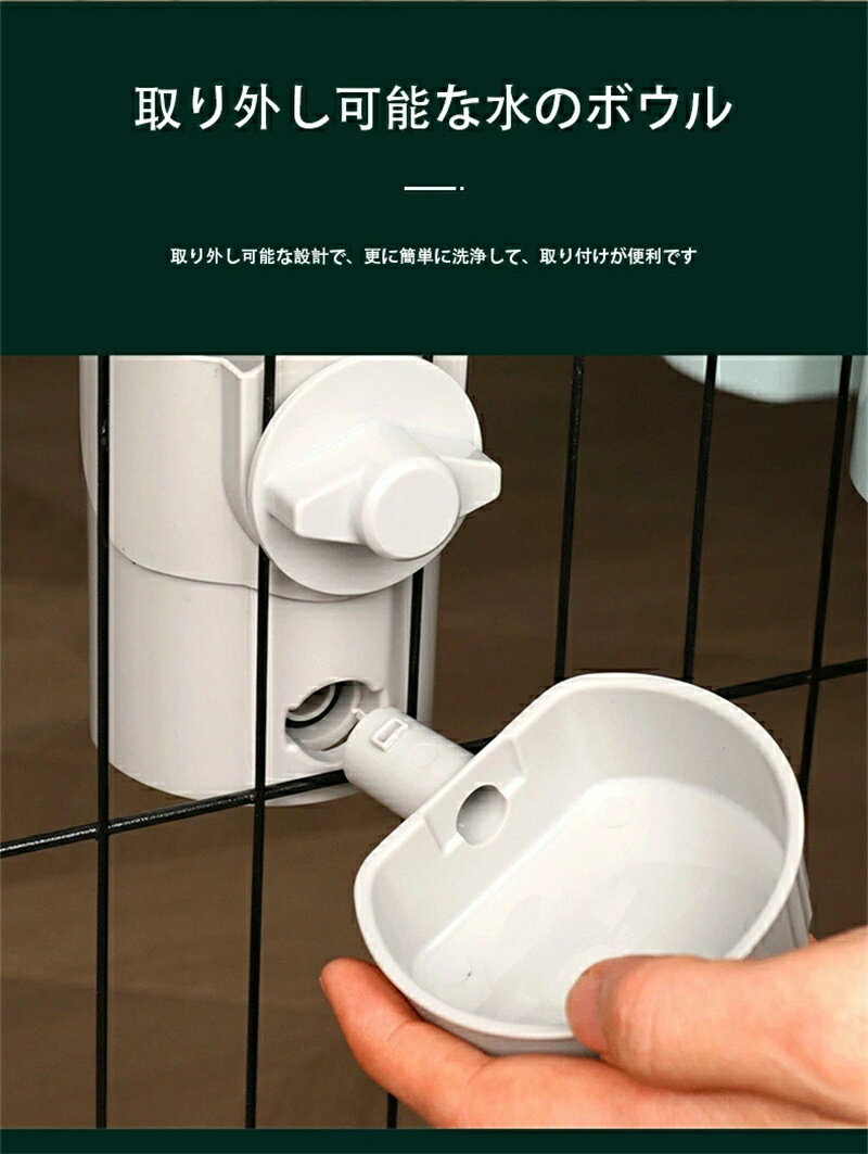 この商品について 【お留守番対策】大容量のフードストレージで、頻繁にフードを補充する必要がなく、猫や小型犬の4-5日分の食事を保証します。帰宅が遅い時や、急な出張、短時間の旅行など飼い主さん不在でも、オートペットフィーダーはネコちゃん、ワンちゃんに自動給餌給水で安心安全です。 【多機能設計】給餌器&給水器&給餌器+給水器、餌入れと水入れのペット食器セットは省空間で、便利です。ケージのどこにでも取り付けられます。そして、ネジで壁、木、ケージなどの任意の場所に固定することができます。野鳥給餌器 餌台としても使えます。 【良質材料&サイズ】高品質でお手入れしやすく丈夫で、洗いやすいです。スローフードボウルはいい素材で作られており、餌やりは安心である。高級マットテクスチャ、食品グレードの健康的な材料。給餌器サイズ::14,5*21*31cm/給水器サイズ:16*8.5*22cm。重量:0.5kg 【簡単に組み立て】初心者でも取り付けやすいシンプルなデザイン設計です。変位を避けるための固定ノブ、脱落を防ぎ、分解しやすい。ケージ内部に引っ掛けるやケージ外部に合わせて簡単に引っ掛けられます。 【透明の本体】科学的摂食、透明で中身が見やすく、餌の状況がよくわかりエサの容量も簡単に把握することができるます。高さが調節可能ので、ケージによって、ペットにぴったりの高さに調節できます、食事も便利になります。