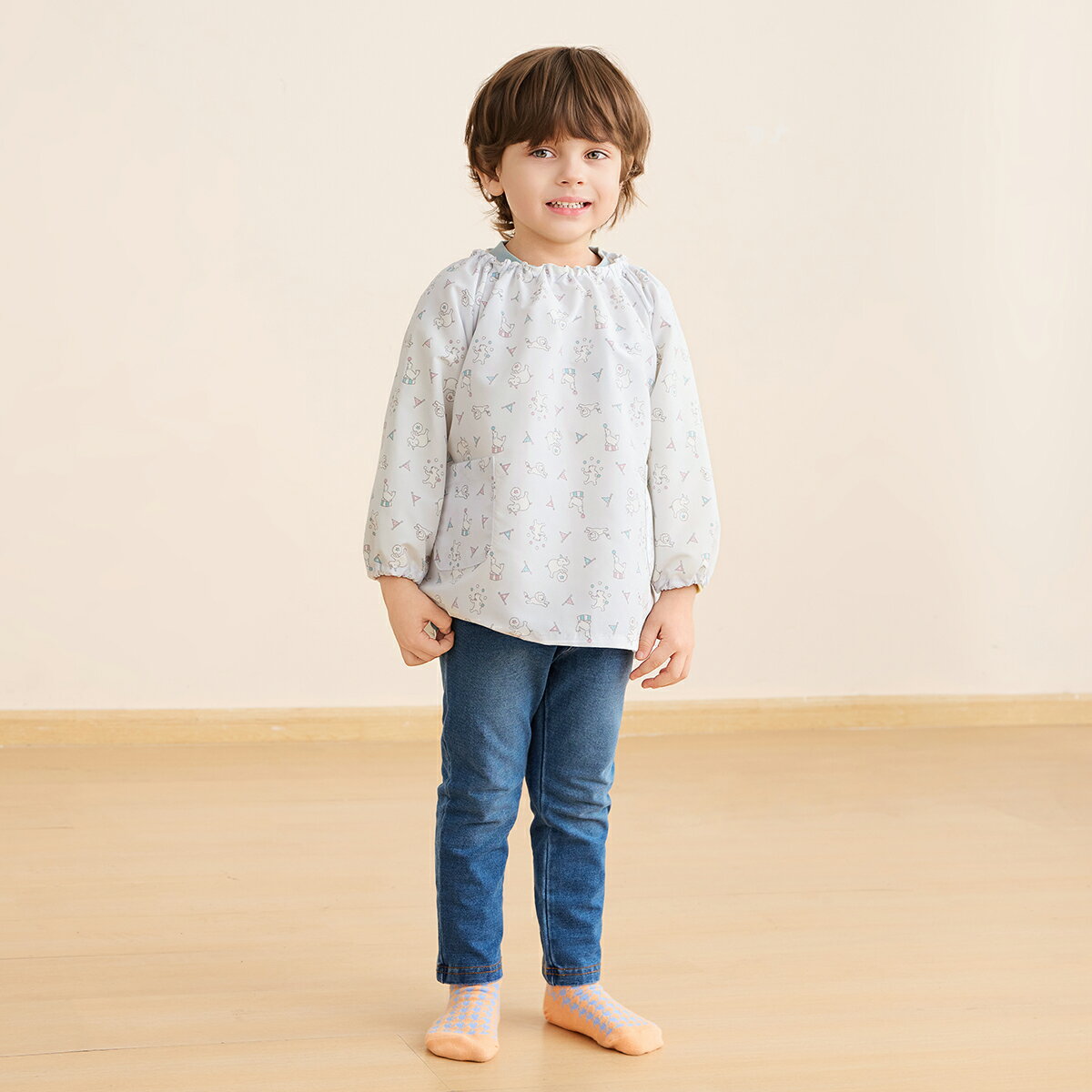 モデル身長:104cm 着用サイズ:100 商品について 【素材】優れた撥水性能を持つ、はっ水加工を施したポリエステルタフタ素材を使用しました。水や汚れに強く、サッと拭くだけでお手入れカンタン。保育園・幼稚園でのご使用だけでなく、お絵描きや工作、粘土遊びの時、お料理などのママのお手伝いの時、お外遊びでお洋服を汚したくない時、またお食事のエプロンとしても、さまざまなシーンで大活躍します。 【柄】ライトグレーは、やさしい色合いのグレイッシュカラーにサーカスで芸を披露する動物たちの柄が楽しくオシャレな、男女ともにおススメの一枚。ライトベージュは、コンビミニらしくクジラ&アンカーの柄でマリンテイストに仕上げました。ライトピンクは、淡くやさしい色合いのフルーツ柄が可愛らしい印象です。3色ともに汚れがついても気にならない色合いをセレクトしています。 【仕様】ジャストサイズでもゆったり着れるようなシルエット設計にしています。また、衿ぐりはゴム入りで頭からスッポリ被るだけのお着替えカンタン仕様なので、お子様一人でのお着替えもラクチン。袖口部分はやわらかゴム仕上げて締め付けすぎず、長袖タイプなので腕も汚れから守れます。 【ポケット】あり 【伸縮性】なし 【透け感】透けない 【クリーニング】洗濯機洗い可 【裏地】なし 【備考】はっ水加工 モニター・環境等により実際の商品と色味が多少異なって表示される場合がございます。 また、生産時期により色・形が若干異なる場合がございます。予めご了承ください。 素材ポリエステル100%(ポリエステルタフタ) カラー展開 ライトグレー、ライトベージュ、ライトピンク サイズ展開 90、100、110、120 サイズについて 90身幅:40cm/着丈:44cm/裄丈:43cm100身幅:43cm/着丈:47cm/裄丈:46cm110身幅:46cm/着丈:50cm/裄丈:49cm120身幅:49cm/着丈:53cm/裄丈:52cmベビー服サイズの選び方 >> ブランドについて Combiminiベビー服は、大切な赤ちゃんが初めてみにつけるものだから。コンビミニは「本当にいいもの」を身につける喜びをベビーとママ、パパにお届けしたいと願っております。長年赤ちゃんを見つめてきたベビー用品総合メーカーとして、培ってきた「赤ちゃん工学」をフル活用し、着ごこち、動きやすさ、着せやすさなど、あらゆる面にこだわりを一つ一つ丁寧に仕上げています。ベビーがたくさん笑ってくれるような服を、これからもお届けします。 ギフトラッピングをご希望の方 >>