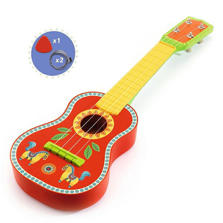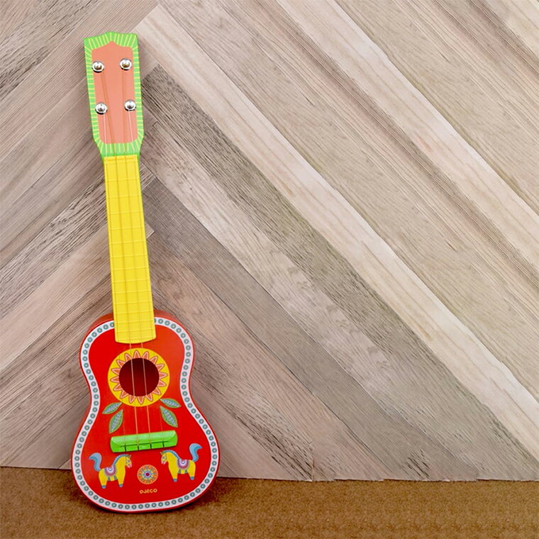 DJECO ジェコ ウクレレ です。 子どもが持ちやすいサイズに設計された4弦の木製ウクレレです。 本物そっくりに作られているおもちゃのウクレレなので、遊びながら音を鳴らす楽しさや音楽に親しむきっかけになります。 見ているだけで元気をもらえるようなビタミンカラーと動物のモチーフが可愛らしいですね。 遊びながら音を鳴らす楽しさを体感してください。 ※玩具のため正確な音階ではありません。 DJECO(ジェコ)について DJECO(ジェコ)は1954年設立のフランスの4大おもちゃメーカーのひとつになります。 最大の特長はデザインと色の使い方にあります。 フランスを中心に活躍する100名以上の絵本作家やイラストレーターがそれぞれ得意な表現方法を駆使して、おもちゃのデザインをしています。 そのデザインされたおもちゃは子供達の感性と想像力を育み、世界中で愛用されています。 DJECO(ジェコ)のおもちゃは、これまでにヨーロッパのおもちゃ賞を数多く受賞し、各国の美術館などでも販売されています。 またトレードマークは、家に住み着くと幸せになるというトカゲ(Gecko/ゲッコ)から由来されています。 「DJECO」という社名には、「みんなが幸福になれるように」というそんな想いが込められています。 ●パッケージサイズ 約54cmx20.5cmx7cm ●商品サイズ 約53cmx17cmx5cm ●商品内容 ウクレレ(4弦)x1、予備の弦x2、ピックx1 ●素材 木、金属 ●対象年齢 3歳〜 ●デザイナー Magali Attiogbe ●CE ヨーロッパ安全規格、おもちゃ安全基準「EN71」適合品 子どもがなめても安全な塗料を使用しています。 ※DJECO ジェコはヨーロッパを中心に活躍している100名以上のデザイナーと共同で商品を企画しています。 フランス/DJECO/djeco/ジェコ/おしゃれ/DJECO(ジェコ)は1954年設立のフランスの4大おもちゃメーカーのひとつになります。 子どもの成長にとって、遊びは大変重要なものと考えているジェコのおもちゃは、子どもたちを楽しくさせ、知育的で想像力を育むものばかりです。 ジェコのおもちゃは、これまでにヨーロッパのおもちゃ賞を数多く受賞し、各国の美術館などでも販売されています。 ジェコのロゴは、家に住み着くと幸せになるというトカゲ(Gecko/ゲッコ)から由来されています。 「DJECO」という社名には、「みんなが幸福になれるように」というそんな想いが込められています。 おもちゃの最大の特徴であるデザインと色の使い方は、フランスを中心に活躍する100名以上の絵本作家やイラストレーターがそれぞれ得意な表現方法を駆使して、デザインをしています。