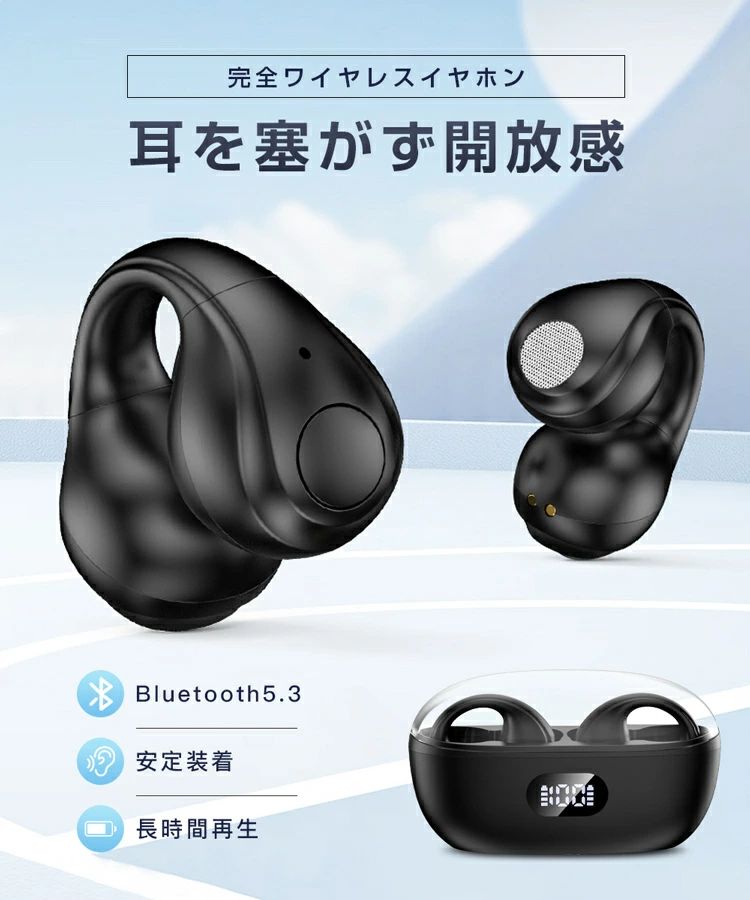 【基本仕様】 重量:約37.2g サイズ:70.5mm×39.4mm×28.3mm Bluetoothバージョン:5.3 連続通話時間:最大4時間連? 音楽再生時間:最大4時間 充電時間:約1.5時間 接統可能距離:最大約10m(障害なし) 再生周波数?域:20-20000Hz ストレスフリーデザイン 従来のインナー型イヤホンと違い、耳に入れないオープンイヤーデザインが特徴 ■耳に入れないため、運動時の汗などによる耳の病気を避ける ■柔らかい素材を採用。長時間の再生でも痛くなりにくい ■眼鏡を使用されても、気にせずにイヤホンを楽しめる 関連キーワード: ワイヤレスヘッドセット Bluetooth5.2 ワイヤレスイヤホン LED付き 収納ケース 軽量 Siri対応 ノイズキャンセリング iPhone 防水 片耳 両耳 2023年最新 ノイズキャンセリング iPhone13 SE3 マイク 表示 通話 プレゼント 通勤通学 短期旅行 出張 最新版 ブルートゥースイヤホン 敬老の日 2023 イヤホン 骨伝導 ワイヤレスヘッドセット HiFi音質 Bluetooth5.1 マイク 安定装着 バッテリー ワイヤレスイヤホン LED付き 収納ケース 軽量 Siri対応 ノイズキャンセリング iPhone 防水 片耳 両耳 2023年最新 ノイズキャンセリング iPhone13 SE3 マイク 表示 通話 プレゼント 通勤通学 短期旅行 出張 最新版 2023 2024 ワイヤレス イヤホン BLUETOOTH