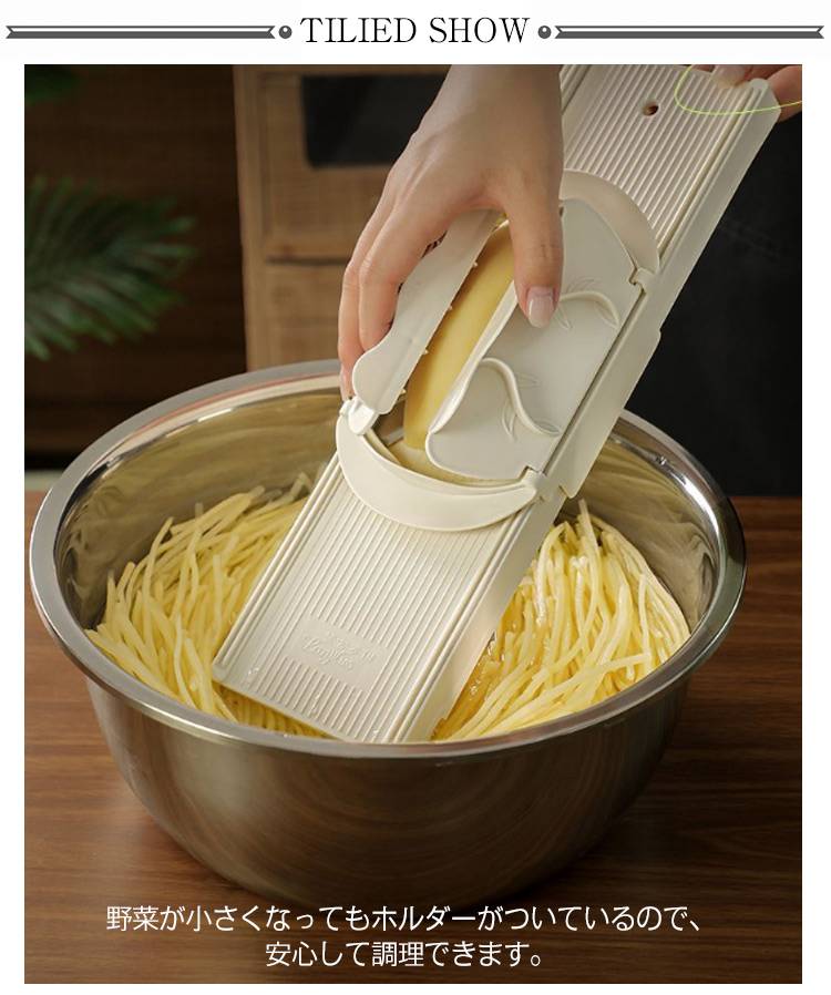 ワイドな刃幅でキャベツはもちろん、カブや大根、タマネギなどを簡単・手軽にスライスができます。 食品グレードのPP素材でできており、ステンレスの刃は非常に鋭く、無毒で防錆効果があります。 千切り・細千切りの刃は、形状を四角にしたことできれいな切り口を実現、軽い力でプロのような千切りができます。 野菜が小さくなってもホルダーがついているので、安心して調理できます。 野菜炒め用の玉ねぎ、キャベツ、みそ汁の大根、包丁がほとんど使わずに調理できます。 サイズ 5点セット サイズについての説明 サイズ:35*10*2.3cm ※測定方法によって誤差が生じますので、予めご了承下さい。 素材 ステンレス プラスチック 色 写真色 備考 ●サイズ詳細等の測り方はスタッフ間で統一、徹底はしておりますが、実寸は商品によって若干の誤差(1cm〜3cm )がある場合がございますので、予めご了承ください。 ●製造ロットにより、細部形状の違いや、同色でも色味に多少の誤差が生じます。 ●パッケージは改良のため予告なく仕様を変更する場合があります。 ▼商品の色は、撮影時の光や、お客様のモニターの色具合などにより、実際の商品と異なる場合がございます。あらかじめ、ご了承ください。 ▼生地の特性上、やや匂いが強く感じられるものもございます。数日のご使用や陰干しなどで気になる匂いはほとんど感じられなくなります。 ▼同じ商品でも生産時期により形やサイズ、カラーに多少の誤差が生じる場合もございます。 ▼他店舗でも在庫を共有して販売をしている為、受注後欠品となる場合もございます。予め、ご了承お願い申し上げます。 ▼出荷前に全て検品を行っておりますが、万が一商品に不具合があった場合は、お問い合わせフォームまたはメールよりご連絡頂けます様お願い申し上げます。速やかに対応致しますのでご安心ください。