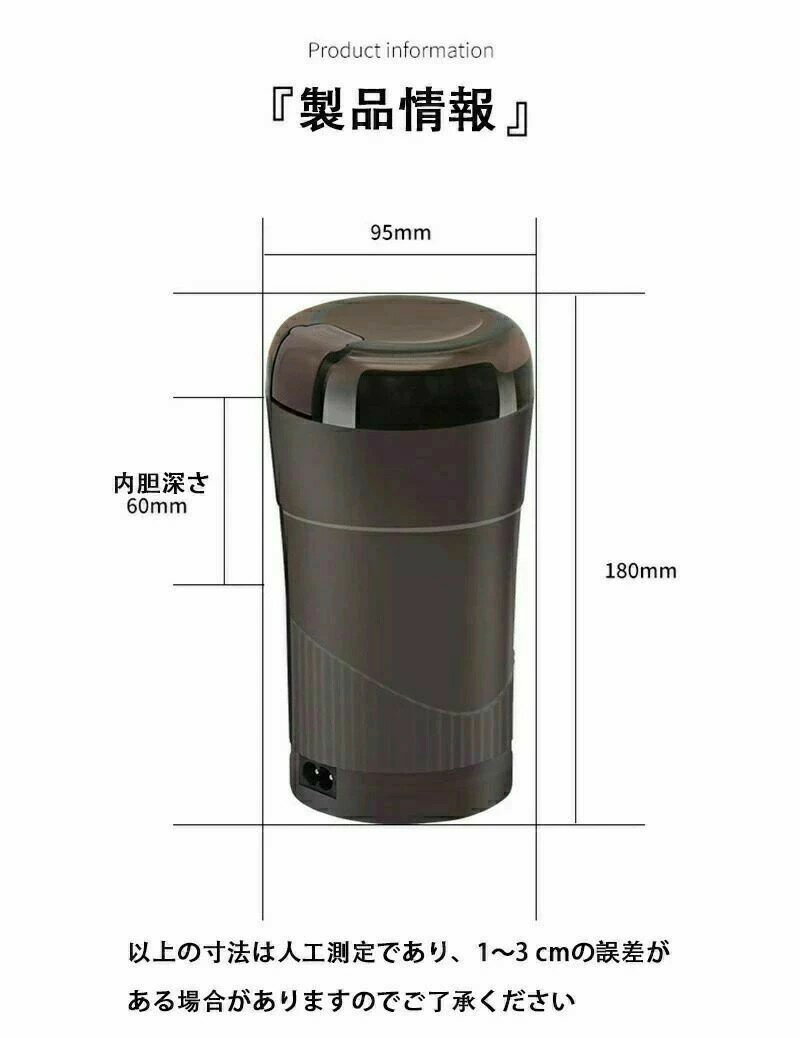 強大なハイパワーで効果抜群★最大150Wのハイパワーで、鋭い鋼ブレードの切れ味がよくて、パワーを発揮して、コーヒー豆をあっという間に挽き上がります。本電動コーヒーミルは精密な構造で騒音がより小さくなります。小ぶりで豆が入る量は多くないですが、香りや味をを楽しむのにはちょうど良いです。 小型ながら良い仕事できる、サイズがミニなので置き場も邪魔にならず、コンパクトで収納しやすいです。底部分に収納スペースがあり、電源コードがおさまられていて、スッキリします。 ワンタッチ操作で粒度を調整可能、コーヒーミルの蓋から挽く具合を確認できて、お好きな粒度(粗挽き、中挽き、細挽き)によって、時間をコントロールすることがてきます。ボタンを押す長さで引き具合が変えられて、スイッチを押す時間が長いほど、コーヒー粉は細かくなります。 水洗い可能でお手入れが楽、容器内部とブレードは304ステンレス鋼を使用しており、水で洗っても錆びないです(モーターの部分は洗えません)。または掃除ブラシが付いて、お手入れがだいぶ簡単になります。 多目的で利用の幅が広い、本コーヒーミルは強力なモーターと丈夫なステンレス鋼ブレードで、コーヒー豆だけではなく、中が洗えるので、風味が異なる食材を砕くのに、穀物、お茶、米、大豆、ココ、コショウなどに適用します。利用の幅が非常に広いです。