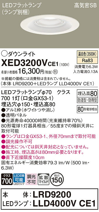 パナソニック XED3200VCE1(ランプ別梱) 軒下用ダウンライト 天井埋込型 LED(温白色) 拡散マイルド配光 防湿・防雨型 埋込穴φ150 ホワイト