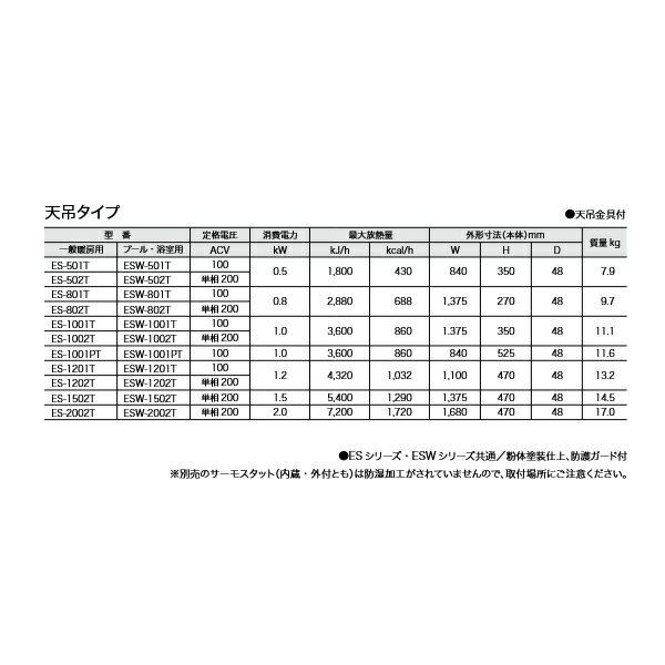 ■サーモスタット別売■吊金具付※別売のサーモスタット(内蔵・外付とも)は防湿加工がされていませんので取付場所にご注意ください。 ■メーカー直送の注意事項■↓以下、必ずご確認ください↓※代金引換(代引き)でのお支払いはご利用いただけません。※お届けの際の時間指定はできません。※日曜及び祝祭日の配送はできません。※ご不在などによりお受け取り頂けなかった場合、再配達料金が発生します。 (確実なお届けのため、携帯電話番号をご記入ください。)※こちらの商品は軒先渡しとなります。 ビル・マンションへの配送はエントランスでのお渡しとなります。※沖縄・離島など一部お届けが対応出来ないエリアがございます。ご了承下さい。※四国・九州は送料がかかる場合があります。 【各メーカーお問い合わせ先一覧】 製品に関するお問い合わせはこちらからお願い致します。 2025年11月時点のメーカー情報・カタログ情報に準拠しております。 ※型番を事前にご確認の上、お問い合わせいただきますよう宜しくお願い申し上げます。 ※写真はイメージです ※メーカー都合により外観・仕様は予告なく変更されることがあります。 ご購入前にメーカーサイト等でご確認をお願い致します。 カテゴリ:ヒーター 暖房 メーカー:インターセントラル 型番:ES-1001T / ES1001T ■サーモスタット別売■吊金具付※別売のサーモスタット(内蔵・外付とも)は防湿加工がされていませんので取付場所にご注意ください。 類似商品はこちらインターセントラル ES-1001C サンヒー133,099円インターセントラル ES-801T サンヒート116,764円インターセントラル ES-1002T サンヒー133,099円インターセントラル ES-501T サンヒート108,899円インターセントラル ES-1001M サンヒー123,419円インターセントラル ES-1001PT サンヒ133,099円インターセントラル ESW-1001T サンヒ147,619円インターセントラル ES-1502T サンヒー151,000円インターセントラル ES-802T サンヒート116,764円新着商品はこちら2026/4/24三菱ケミカル・クリンスイ MDC01S 交換カ4,558円2026/4/24三菱ケミカル・クリンスイ HGC9S 交換カー4,762円2026/4/24三菱ケミカル・クリンスイ MDC03SW 交換6,239円再販商品はこちら2026/4/25コニシ 1液型ウレタン樹脂系接着剤 760m20,843円2026/4/25 コニシ ボンド床職人 1液型ウレタン樹脂系20,403円2026/4/25セラトレーディング VLT25R-40 ボラ 68,757円2026/04/25 更新