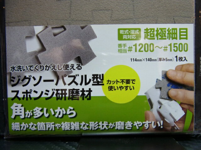 3M ジグソーパズル型 スポンジ研磨材 超極細目(#1200〜#1500 相当)【3M スポンジヤスリ】 1枚入 サイズ : 114 × 140mm (5mm厚) ●3M社製の「スポンジヤスリ」の1シートを12ピースのジグゾーパズル型のピースにカットしたのが「ジグソーパズル型 スポンジ研磨剤です。 ●カットする手間なく、すぐ使える手に持ちやすいサイズ、ジグゾーパズル独特の形状によるエッジ部分でヤスリがけの様々な状況にフィッティングさせることができます ●1シートごと、ジグゾーパズルのピース形状で12ピースにカットされています ・ 1ピースのサイズはおよそ40×40mmほどのサイズ、手にしやすいサイズとなっています ・ ジグゾーのピース形状にカットすることで、エッジになるラインが増え、エッジを利用した様々なヤスリがけの状況へ対応することができます ●スポンジ状の表面をヤスリ面としているので、柔らかく曲面によくなじませて作業を行うこととができます ●「耐水性」ですので、水をつけながらのヤスリがけ作業ができますし、水をつけなくてもヤスリがけを行うことができます