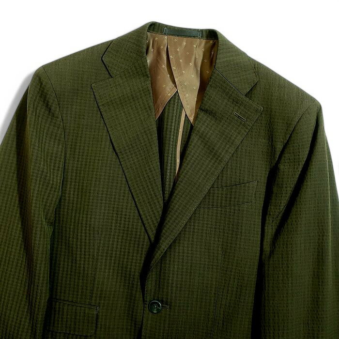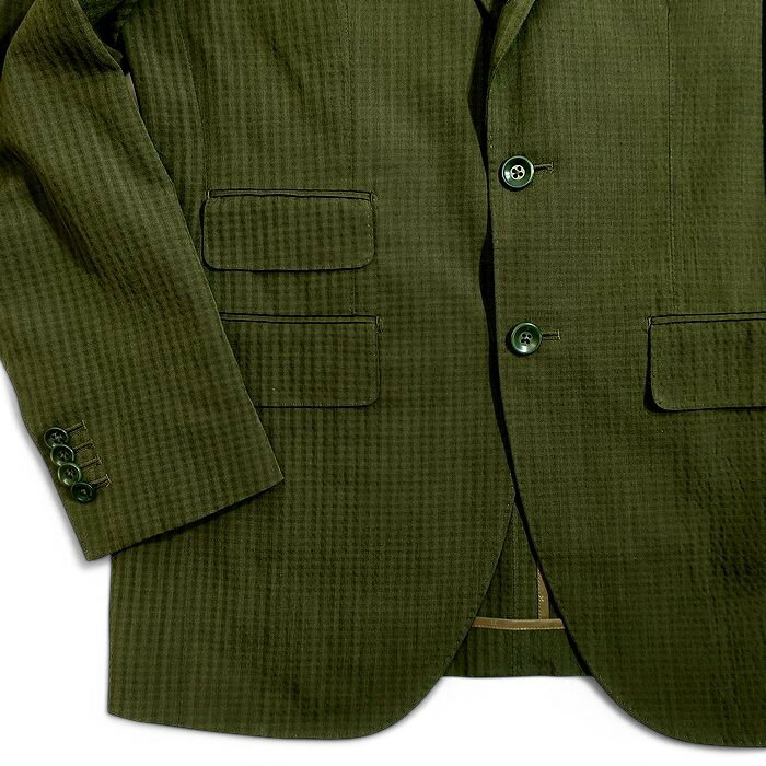 RICHIESTA リキエスタ 大賀 日本製 BoX 伊製生地使用 コットン ウール混 シャドーマイクロチェック サッカー生地 段返り3B 2タック シングルスーツ ジャケット スラックスパンツ 188A9803 モスグリーン AL▲074▼50213k04