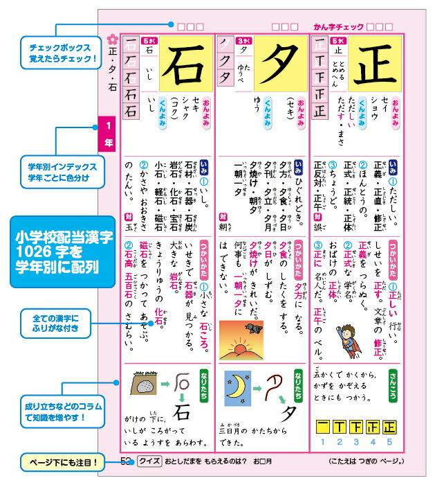 商品情報規格A5判 カラー 416ページ小学生の漢字字典 小学校配当漢字1026字の字典 リラックマ卒園、入学のプレゼントに メール便(レターパックライト)でのお届けです 調べやすく、読みやすい楽しく学べるクイズ付き1年生から6年生まで,長く使えるシンプルデザイン表紙は,傷・よごれに強いコーティング加工 4種類のさくいん引きで,低学年でも引きやすい!3〜6年生はもちろん,1・2年生にも漢字字典の引き方の学習がしやすいように,小学校で習う1026字の漢字を学年別に並べています。また,漢字を調べやすくするために,音訓・学年別音訓・部首・総画の4種類のさくいんを用意しています。語いや用例が豊富!子どもたちが漢字を活用できるように,漢字の意味や熟語,用例などを豊富にそろえています。見出し漢字と組み合わせると,対義語,類義語になる漢字も,いっしょに示しています。全ての漢字にふりがなが付いています!一人でも字典で調べられるように,全ての漢字にふりがなが付いています。興味を持って学習できる工夫がいっぱい!イラスト付きのコラムや,ページ下には漢字クイズ,豆ちしきや成り立ちのパラパラまんがを入れています。漢字チェックボックスがあります!漢字を調べたときや覚えたときに,□に印を付けてチェックできます。 2