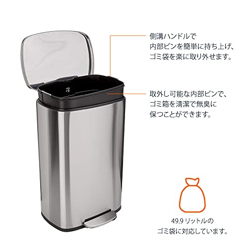 長方形・サテンニッケル 50L C-10074FM-50L・・Size:50LStyle:長方形・手動フットレバー付きの50Lの長方形ステンレス製ゴミ箱・ソフトに閉じるフタが開閉時のノイズを減らし、製品の寿命を延ばすことに役立つ設計・指紋が付きにくく耐久性のあるステンレス製の外装・取り外しやすいプラスチック製の内側バケツ、ゴミ処理しやすい構造・フタを開けたままにするモード(手でフタを90度開けた状態)でゴミ袋を交換可能Amazonベーシックは、お客様に高品質の商品を低価格でお届けすることを目的とした、Amazonグループが全世界で展開するブランドです。 ご購入後、1年間で日本国内を利用頂けます。 (合同会社)